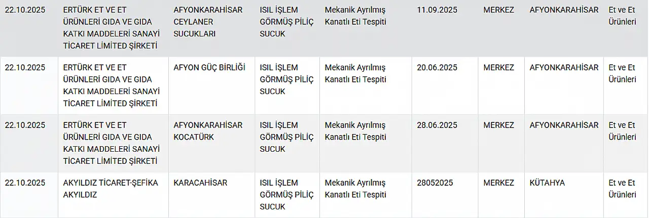 Öte yandan Bakanlık, Afyonkarahisar, Kütahya ve Aksaray’da üretilen bazı sucuklarda mekanik ayrıştırılmış kanatlı eti ve sakatat (baş, dil, taşlık) kullanıldığını belirledi.