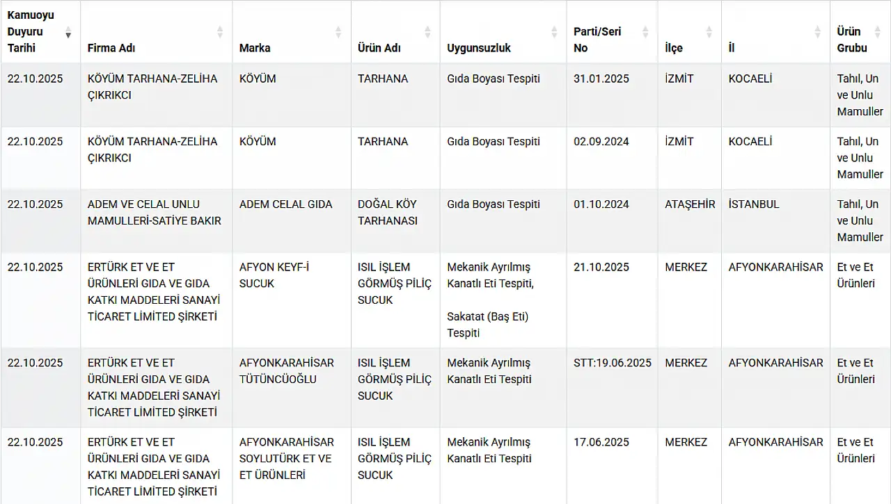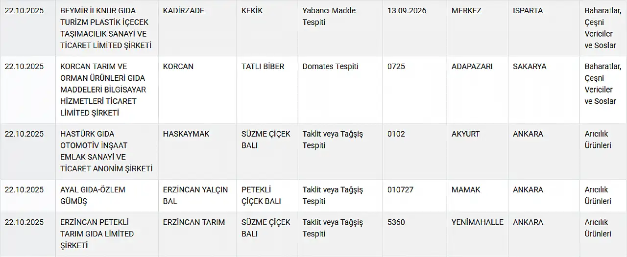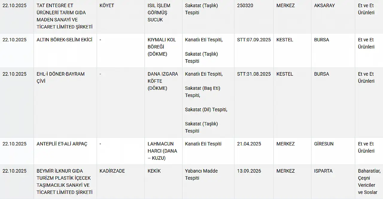 Bakan son olarak listesi 22 Ekim’de güncellendi. Listede tarhanada yasaklı gıda boyasına, kıymalı kol böreği ve dana köftede sakatat eti, baharatlarda yabancı maddelere, balda taklit ürüne ve lahmacun harcında kanatlı ete rastlandı.