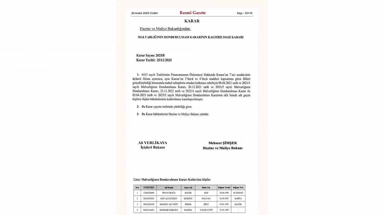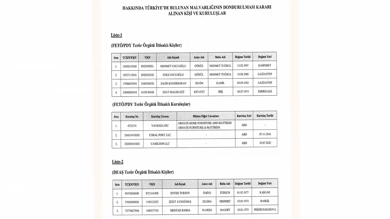 Dikkat çeken gelişme Resmi Gazete’de yayımlandı. Buna göre FETÖ/PYD ve IŞİD (DEAŞ) terör örgütleri ile ilişkili oldukları tespit edilen 7 kişi ve 3 şirketin malvarlığının dondurulduğu ifade edildi. Aynı zamanda 4 kişinin mal varlıklarının dondurulması yönündeki karar ise kaldırıldı.