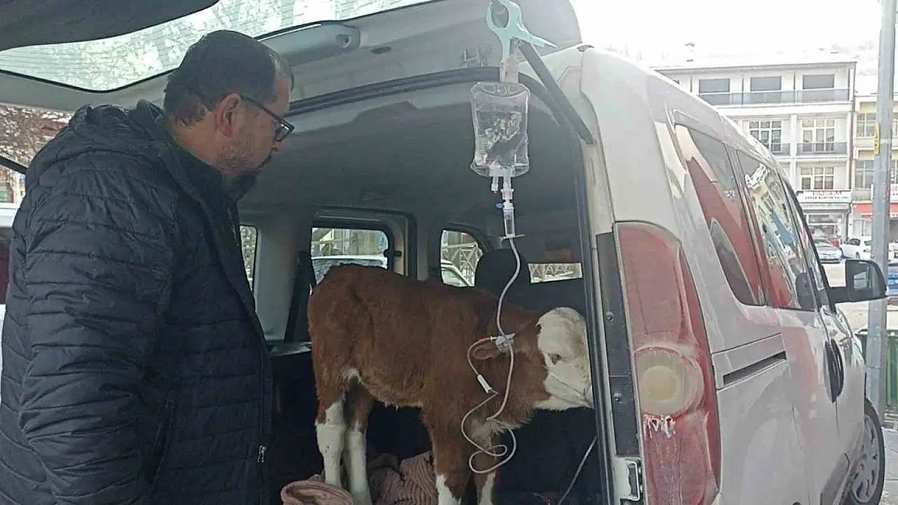 Besici, buzağıyı otomobiliyle ilçe merkezideki bir veterinere götürdü. Veteriner hekim Bülent Köse, zor durumdaki buzağıya acil müdahaleyi aracın bagajında yaptı. Damar yolu açılıp ilaç verilen buzağıya maske takılarak oksijen verildi. Buzağının acil müdahalenin ardından şifa bulduğu öğrenildi.