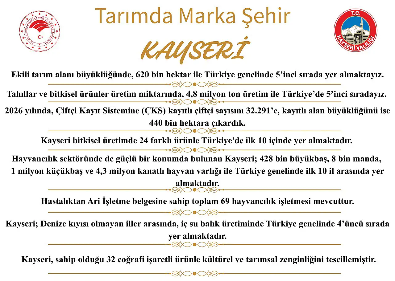 Kayseri'nin ülke genelinde tarımda ilk sıralarda yer aldığını dile getiren Elitaş, ‘Emeğin ekmeğe, alın terinin berekete dönüştüğü şehir. Bereketli şehir Kayseri, toprağın gücünü üretime, üretimi kalkınmaya dönüştüren örnek bir tarım merkezidir. 620 bin hektarlık ekili alanı, 4,8 milyon tonluk üretimi; hayvancılıktan bitkisel üretime uzanan güçlü yapısıyla Kayseri, Türkiye tarımında ilk sıralarda yer almaktadır. 24 farklı üründe ilk 10’da, birçok üründe zirvede olan Kayseri; milyonları aşan hayvan varlığı, iç su balıkçılığındaki başarısı, coğrafi işaretli ürünleri ve artan tarım ihracatıyla gücünü her geçen gün artırmaktadır. Kadın emeğini merkeze alan Organize Tarım Bölgeleri, milyarlarca liralık yatırımlar, binlerce kişiye sağlanan istihdam ve yılın 11 ayında üretim anlayışıyla Kayseri; emeği değerine katan, alın terini berekete dönüştüren bir vizyonun adıdır. Bugün Kayseri’de tarım, emektir, üretimdir, bereketli bir gelecektir. Emeğin ekmeğe, alın terinin berekete dönüştüğü Bereketli Şehir Kayseri; tarımda markadır, geleceği üretir!’ şeklinde konuştu.