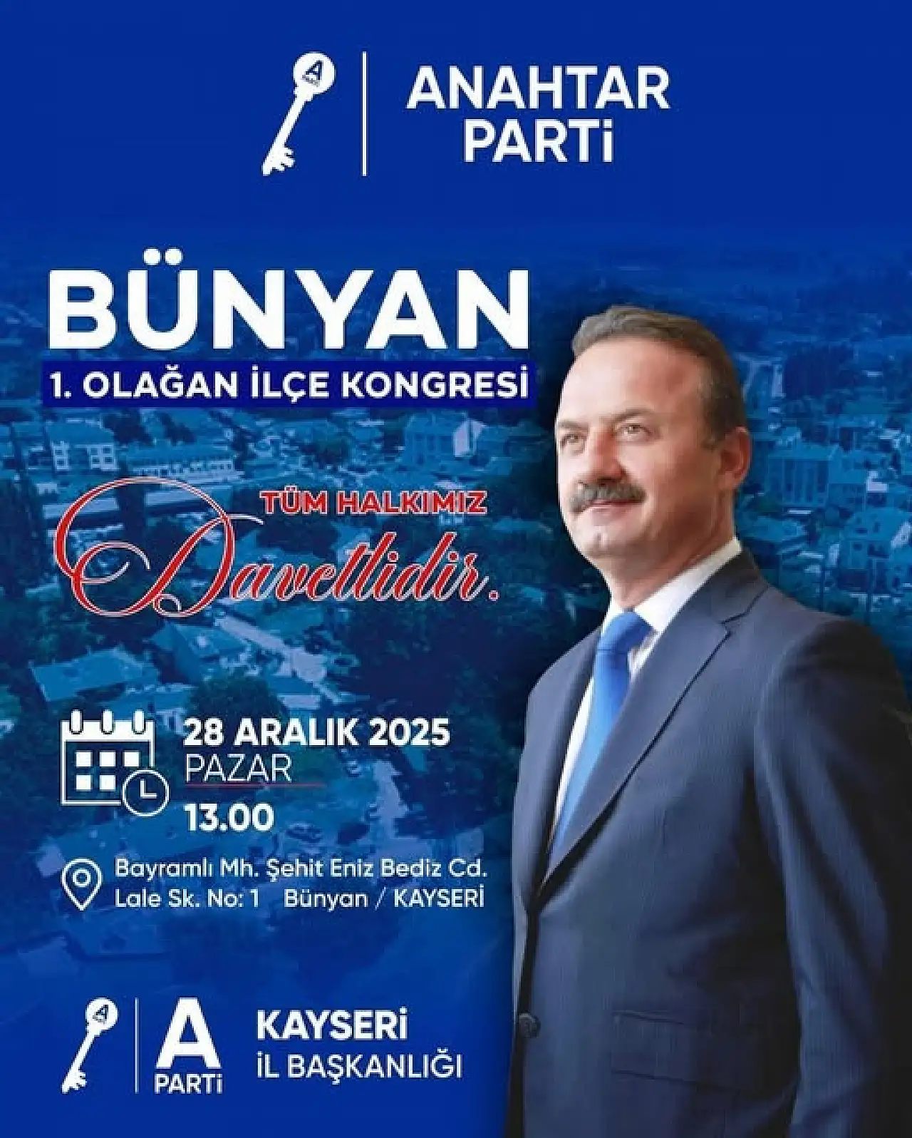 Bünyan’da gerçekleşecek kongre saat 13.00’te başlayacak. Anahtar Parti İl Başkanı Elvan Öztürk, sosyal medya üzerinden yaptığı açıklamada kongrenin büyük bir heyecan ve kararlılıkla gerçekleştirileceğini belirtti. Öztürk paylaşımında; "Bünyan 1. Olağan İlçe Kongremiz, 28 Aralık 2025 Pazar günü büyük bir heyecan ve kararlılıkla gerçekleştirilecektir. Birlik ve beraberliğimizi daha da güçlendireceğimiz, geleceğe umutla yürüyeceğimiz bu anlamlı günde; tüm hemşehrilerimizi, yol arkadaşlarımızı ve gönüldaşlarımızı kongremize davet ediyoruz. Geliniz; Bünyan için, Kayseri için ve yarınlarımız için omuz omuza, coşku ve inançla bir araya gelelim. Kongremiz milletimizin iradesine, davamıza ve ortak geleceğimize hayırlı olsun." ifadelerine yer verdi.