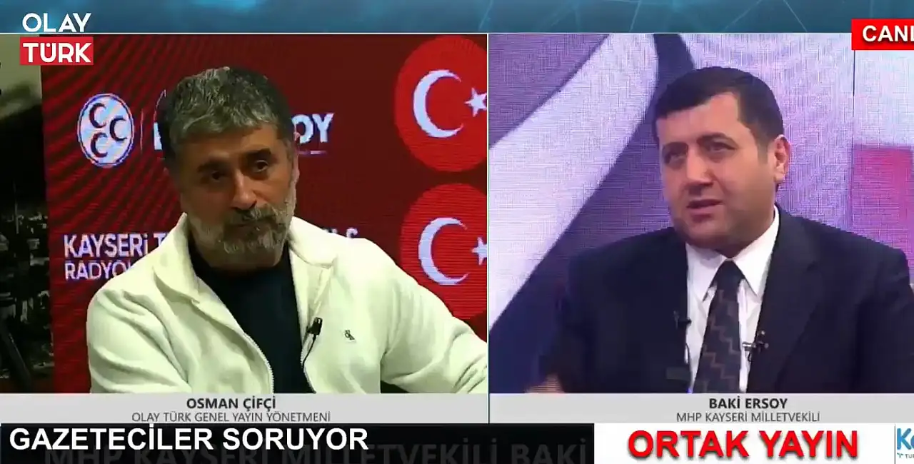 Milliyetçi Hareket Partisi (MHP) Kayseri Milletvekili Baki Ersoy, Kayseri’deki yerel kanal ve radyoların ortak yayınında gazetecilerin sorularına cevap verdi. Gazeteci Osman Çiftci, Metin Kösedağ, Recep Bulut, Ömer Faruk Hamurcu ve Kürşat Açıkgöz Milletvekili Baki Ersoy'a sorularını yönetti.