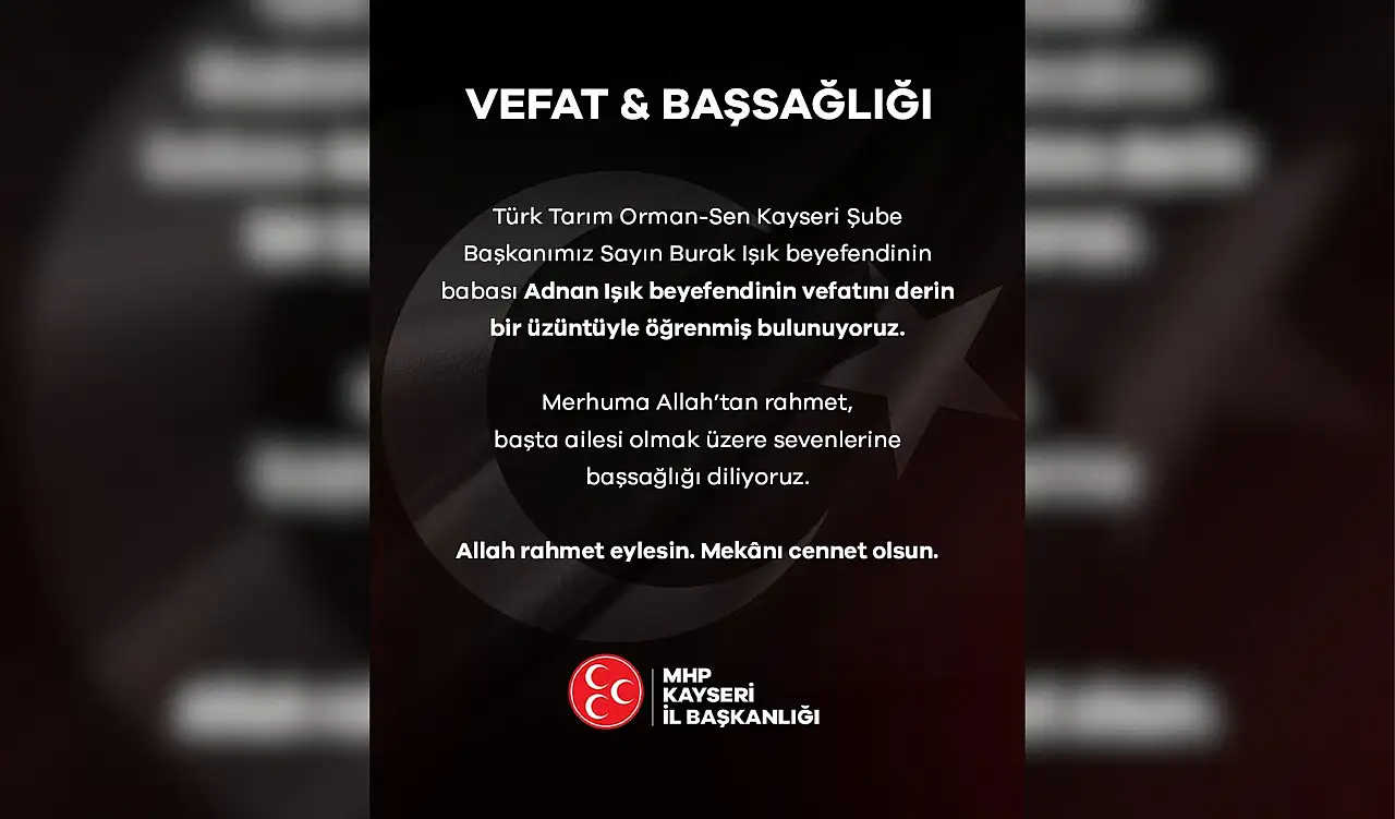 MHP Kayseri İl Başkanlığı, vefat haberinin ardından taziye mesajı yayımladı. Yayımlanan mesajda, "Türk Tarım Orman-Sen Kayseri Şube Başkanımız Sayın Burak Işık beyefendinin babası Adnan Işık beyefendinin vefatını derin bir üzüntüyle öğrenmiş bulunuyoruz" ifadelerine yer verildi.