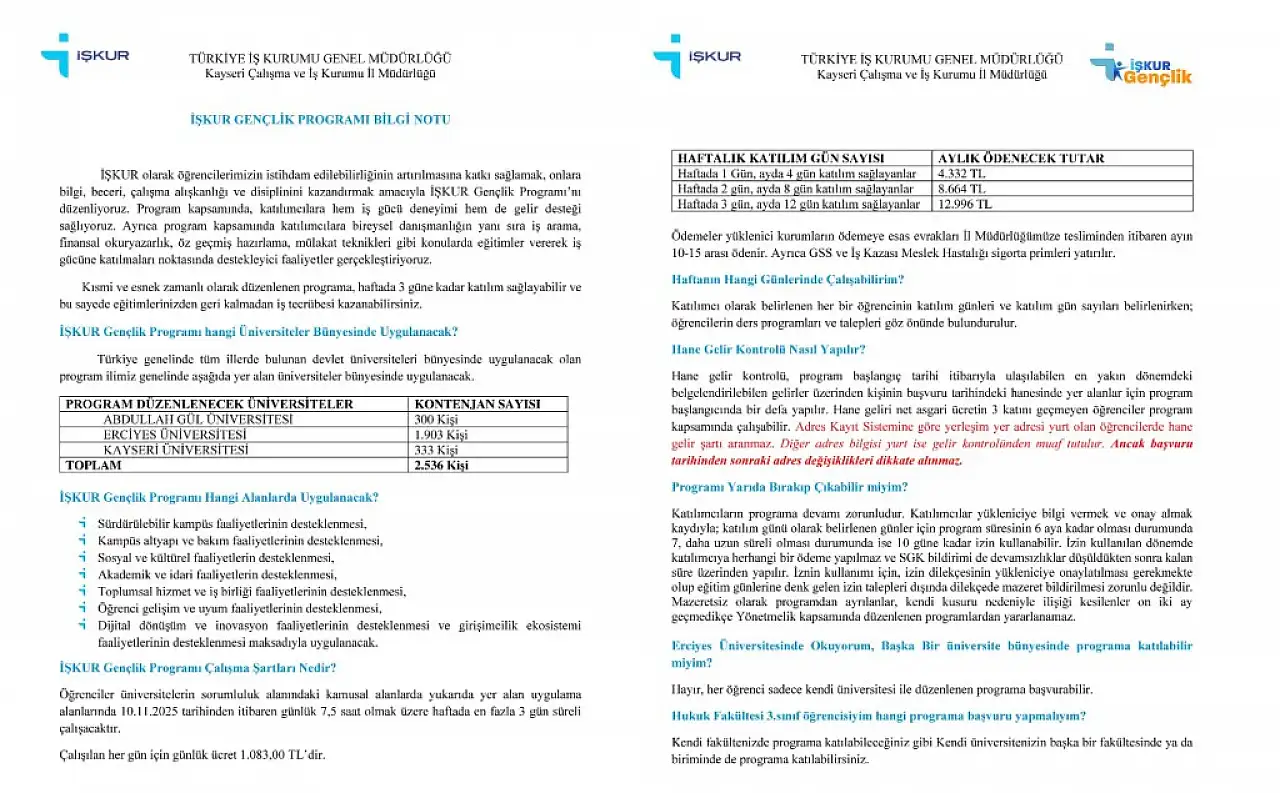 İŞKUR'dan, Kayseri'deki 2.536 üniversite öğrencisine çalışma fırsatı. 15-19 Ekim 2025 arası başvuruları alınacak programda, haftada 3 gün çalışan öğrencilere günlük 1.083,00 TL ödeme yapılacak.