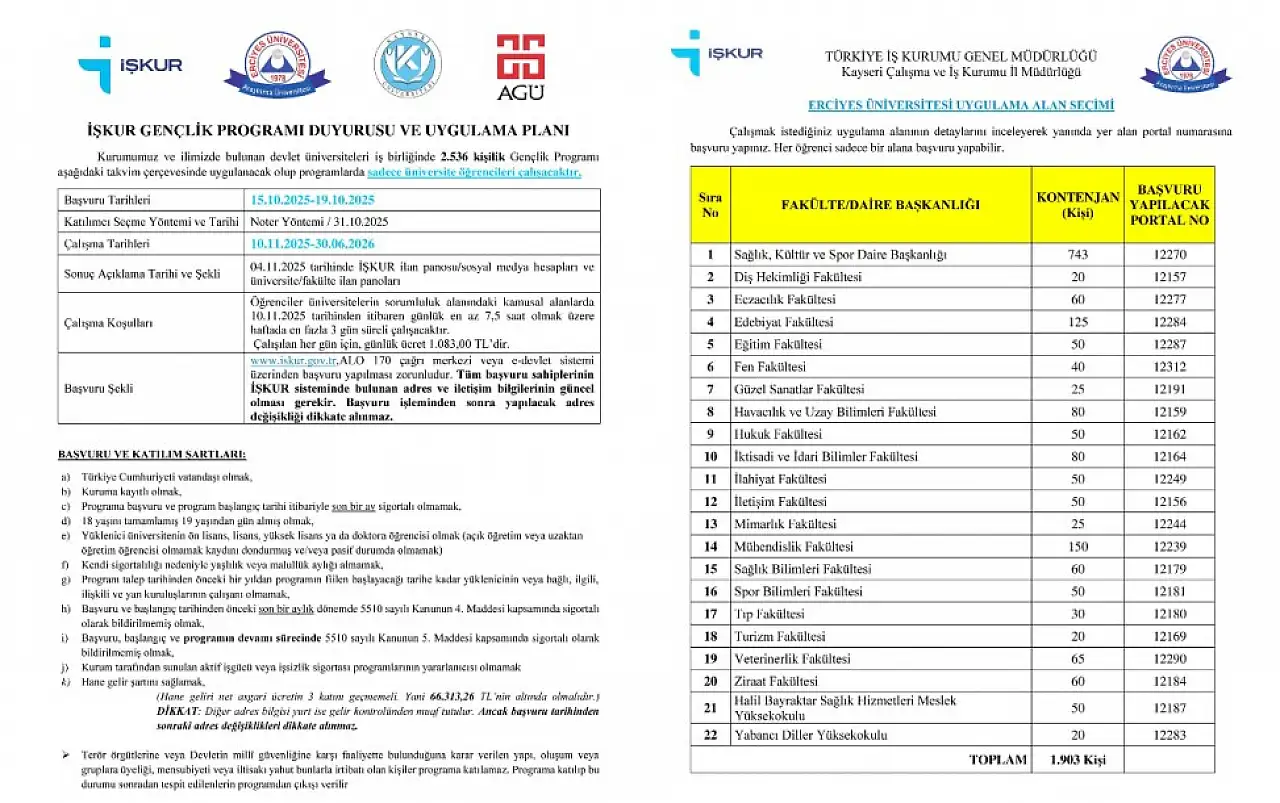 İŞKUR, Kayseri'deki Erciyes Üniversitesi (ERÜ), Abdullah Gül Üniversitesi (AGÜ) ve Kayseri Üniversitesi (KAYÜ) işbirliğiyle önemli bir istihdam programını duyurdu. Toplam 2.536 üniversite öğrencisinin alınacağı İŞKUR Gençlik Programı için başvurular 15 Ekim 2025 tarihinde başlayıp 19 Ekim 2025'te sona erecek.