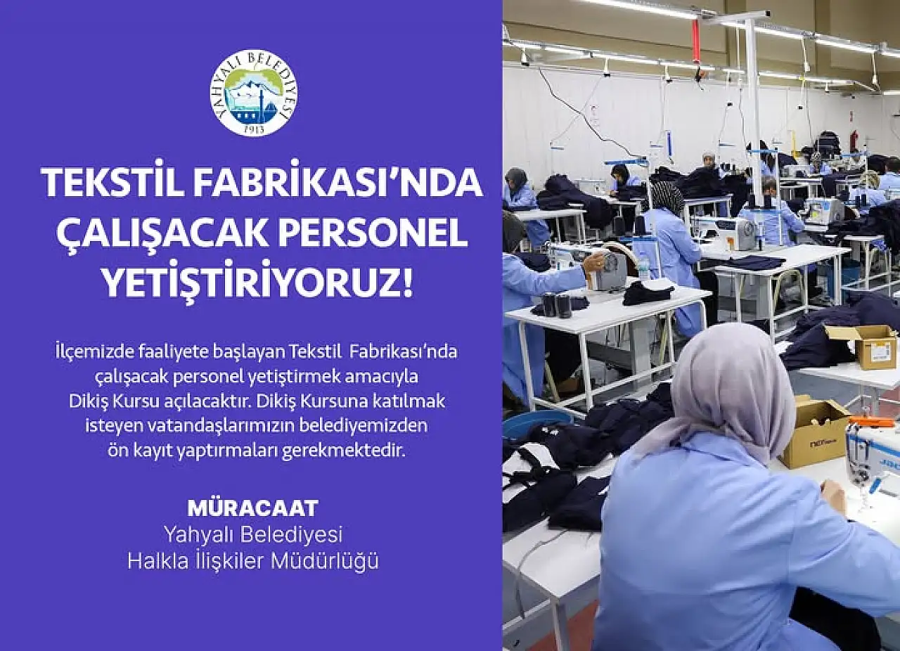 Belediye tarafından yapılan duyuruya göre, yeni kurulan tekstil fabrikasında çalışacak nitelikli iş gücü yetiştirmek üzere Dikiş Kursu açılacak. Dikiş Kursu'na katılmak ve yeni açılan fabrikada iş sahibi olmak isteyen vatandaşların, Yahyalı Belediyesi Halkla İlişkiler Müdürlüğü'ne giderek ön kayıt yaptırmaları gerekmektedir.