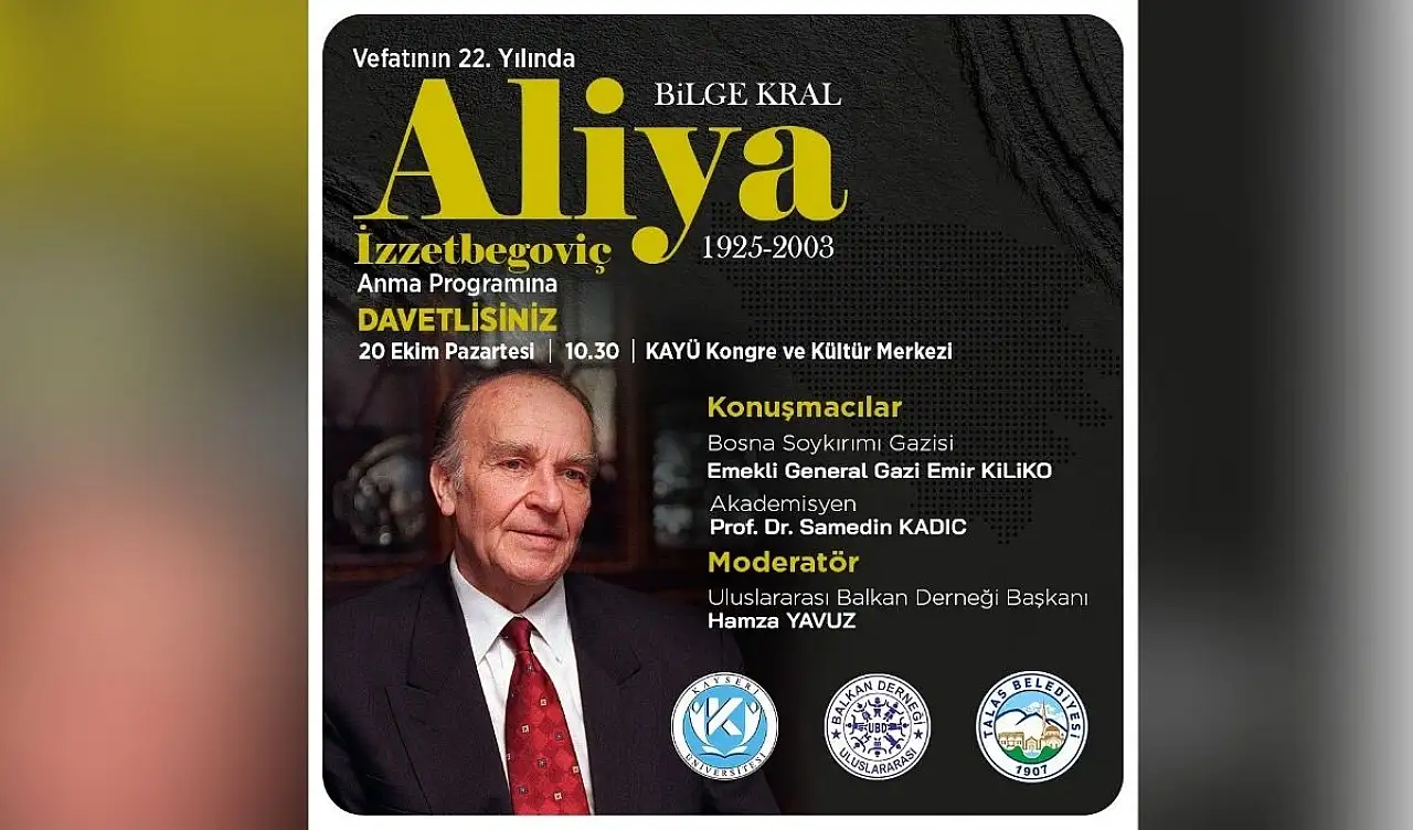 Talas Belediyesi, hafta sonu önemli bir etkinliğe ev sahipliği yapacak. Bosna Hersek'in efsanevi lideri Bilge Kral Aliya İzzetbegoviç'in vefatının 22. yılında anılacak.
