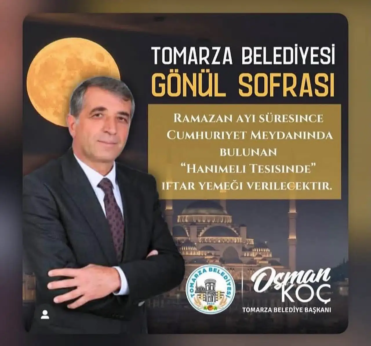 Kayseri Büyükşehir Belediyesi ve Melikgazi Belediyesi'nden sonra Tomarza Belediyesi, Ramazan ayı boyunca vatandaşları aynı sofrada buluşturmaya hazırlanıyor. Belediye Başkanı Osman Koç, "Gönül Sofrası" projesi kapsamında iftar yemeklerinin Hanımeli Tesisinde verileceğini duyurdu.