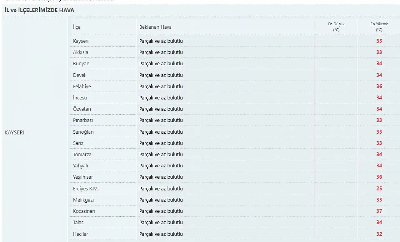 Meteoroloji 7. Bölge Müdürlüğü 05 Ağustos'a ilişkin hava durumu raporunu paylaştı. Meteoroloji 7. Bölge Müdürlüğünden alınan bilgilere göre; bugün Kayseri'de havanın parçalı ve az bulutlu geçmesi bekleniyor. Kayseri'de en yüksek sıcaklık 36 derece, en düşük sıcaklık ise 19 derece olması bekleniyor. En yüksek sıcaklık ise Kocasinan'da 37 derece olması bekleniyor.