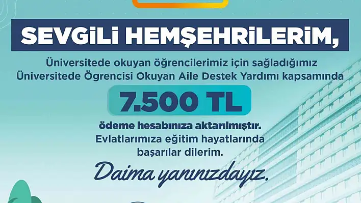 Büyükşehir Belediye Başkanı Dr. Memduh Büyükkılıç'ın 'Üniversitede Öğrencisi Okuyan Aile Destek Yardımı' projesinde, 2025-2026 eğitim öğretim yılı destek ödemeleri hesaplara aktarıldı.