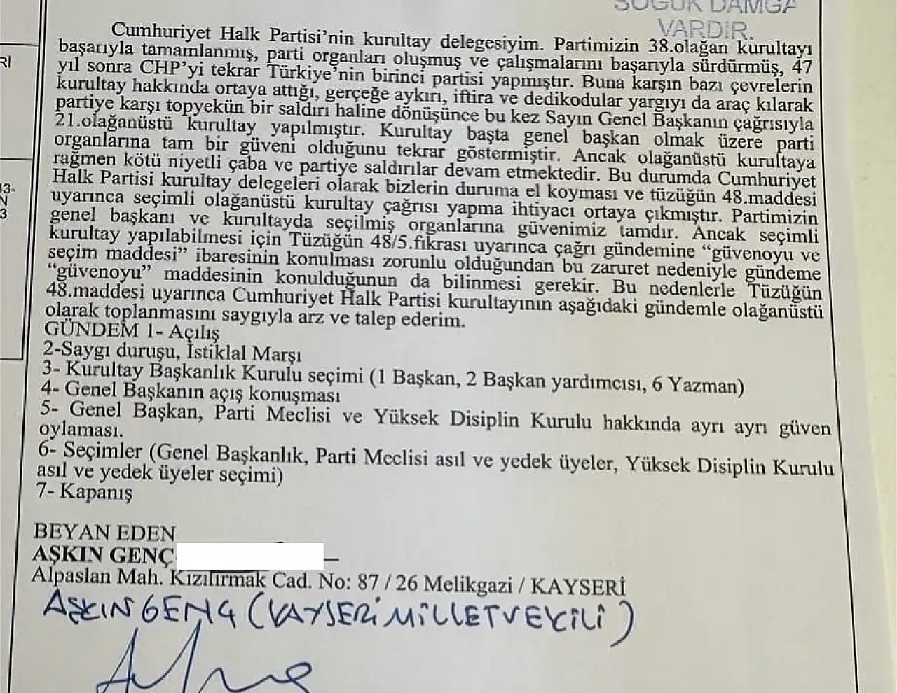 Bu çağrı üzerine CHP Kurultay delegeleri bir bir imzalarını verirken CHP Büyük Kuraltay Olağan delegesi olan CHP Kayseri Milletvekili Aşkın Genç’in de dün Ankara’da olağanüstü kurultayın toplanması için imza verdiği öğrenildi.
