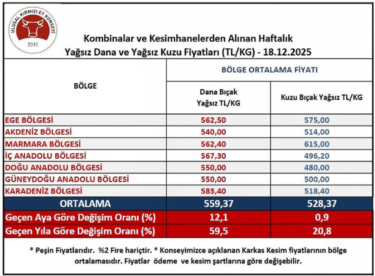 Rapora göre, özellikle İç Anadolu Bölgesi’ndeki yükseliş dikkat çekici boyutlara ulaştı. 18 Aralık itibarıyla karkas yağsız dana kesim fiyatlarında kilogram başına 38,8 TL’lik bir artış kaydedildi. Geçtiğimiz hafta 528,50 TL seviyesinde olan fiyatlar, bu yükselişle birlikte 567,30 TL’ye ulaştı.