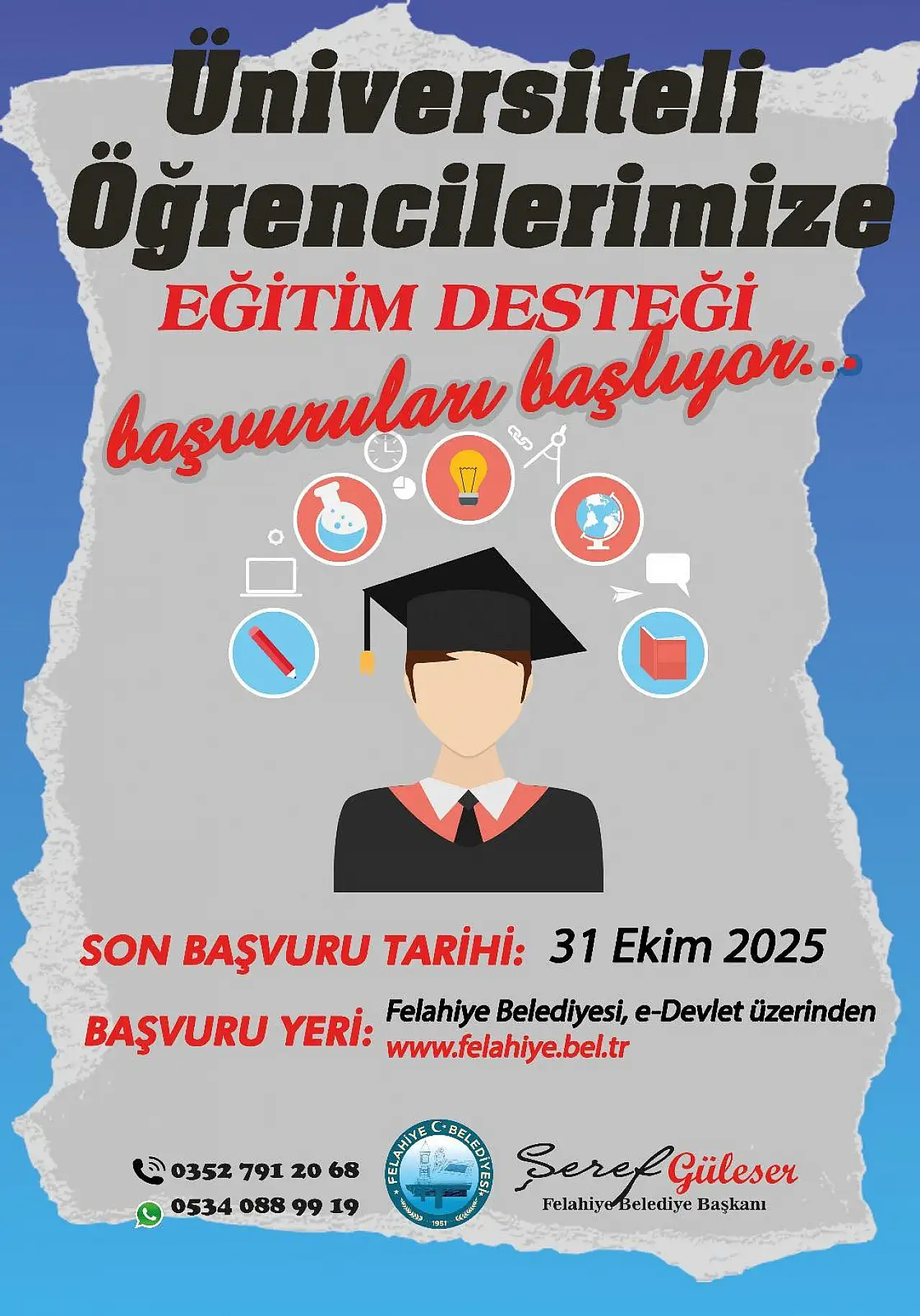 Felahiye Belediye Başkanı Şeref Güleser, Felahiye İlçesi'nde ikamet eden ön lisans ve lisans öğrencilerine yönelik burs verileceğini duyurdu.