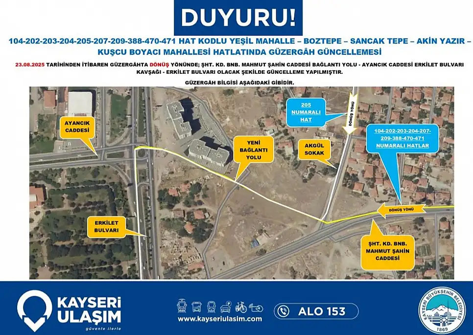 23.08.2025 Tarihinden İtibaren Güzergahta Dönüş Yönünde; Şht. Kd. Bnb. Mahmut Şahin Caddesi Bağlantı Yolu Ayancık Caddesi Erkilet Bulvarı Kavşağı - Erkilet Bulvarı olacak şekilde güncelleme yapılmıştır.