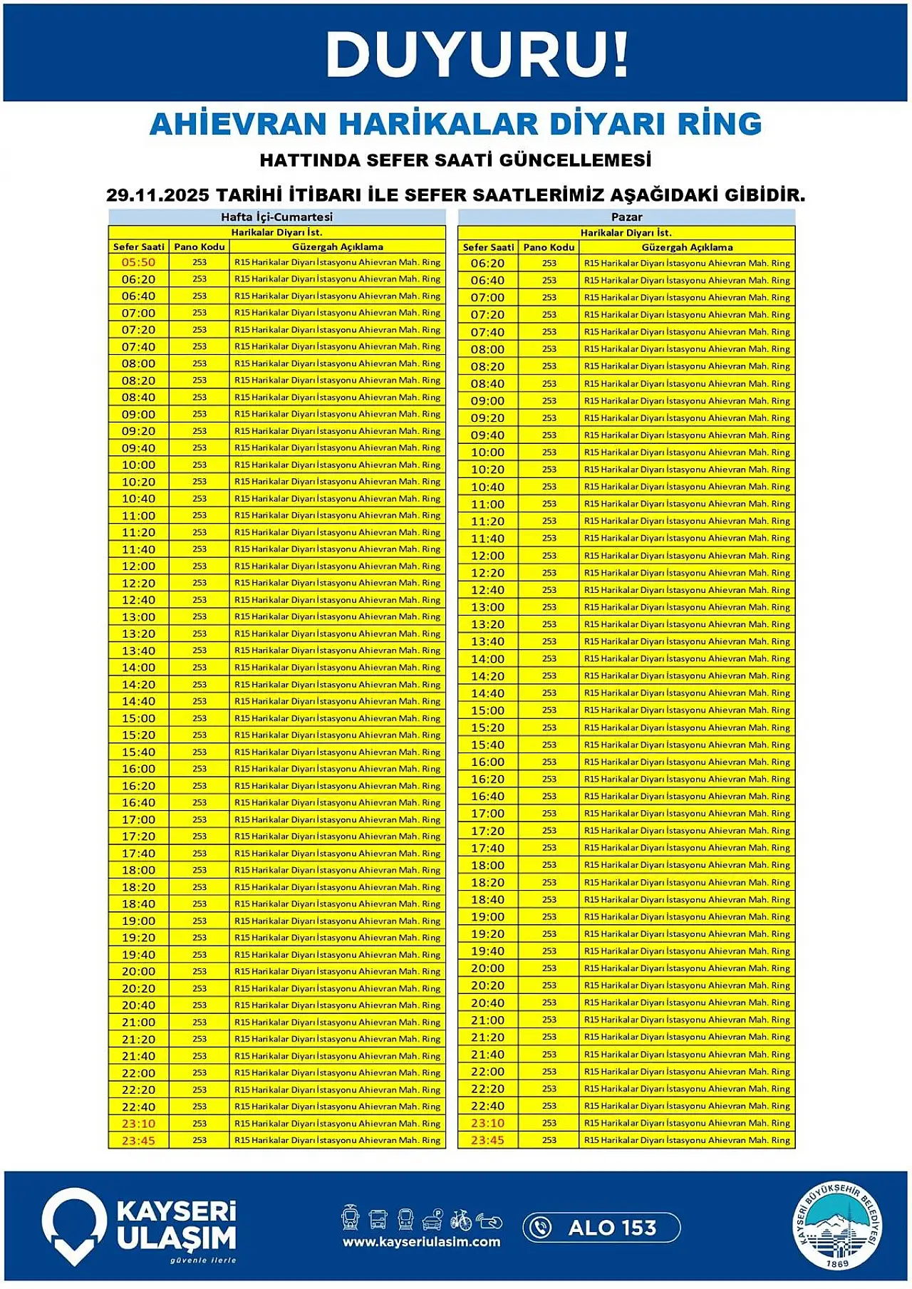 Ahievran Harikalar Diyarı Ring Hattında Sefer Saati Güncellemesi