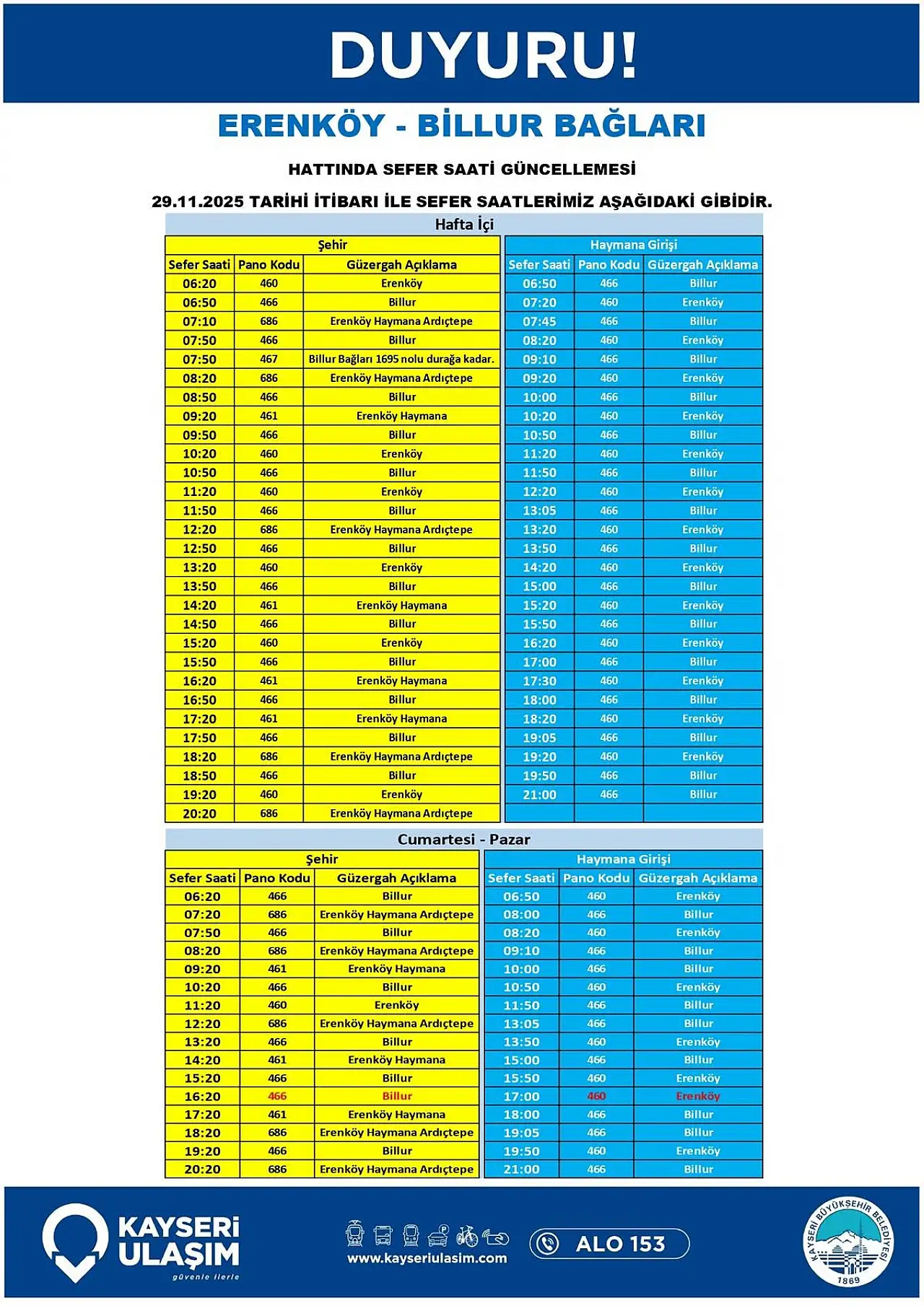 Kayseri Ulaşım A.Ş, 2 otobüs hattının sefer saatlerinde değişikliğe gitti. Detaylar haber bülteninde...