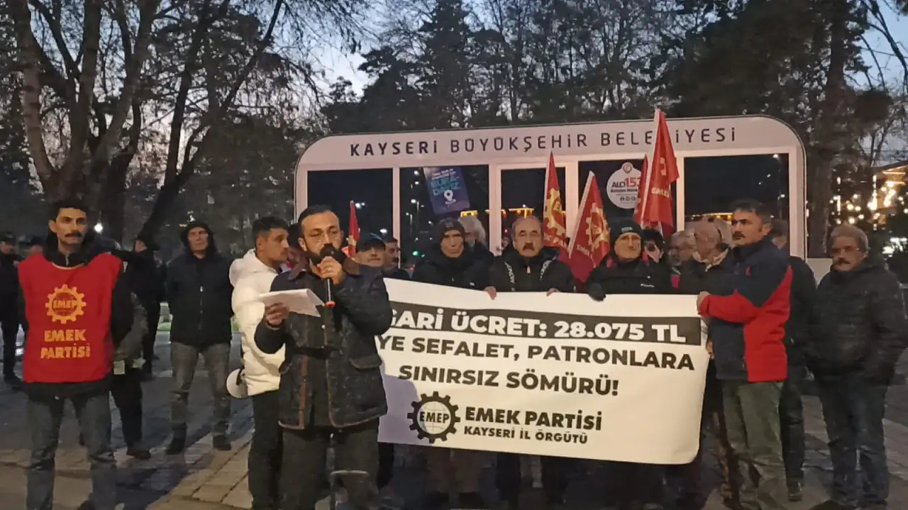Emek Partisi (EMEP) Kayseri İl Örgütü üyeleri, Cumhuriyet Meydanı’nda bir araya gelerek asgari ücret belirleme sürecini ve açıklanan rakamı protesto etti. “İşçiye sefalet, sermayeye sınırsız sömürü” vurgusunun yapıldığı açıklamada, iktidara ve sendikalara yönelik eleştiriler dile getirildi.