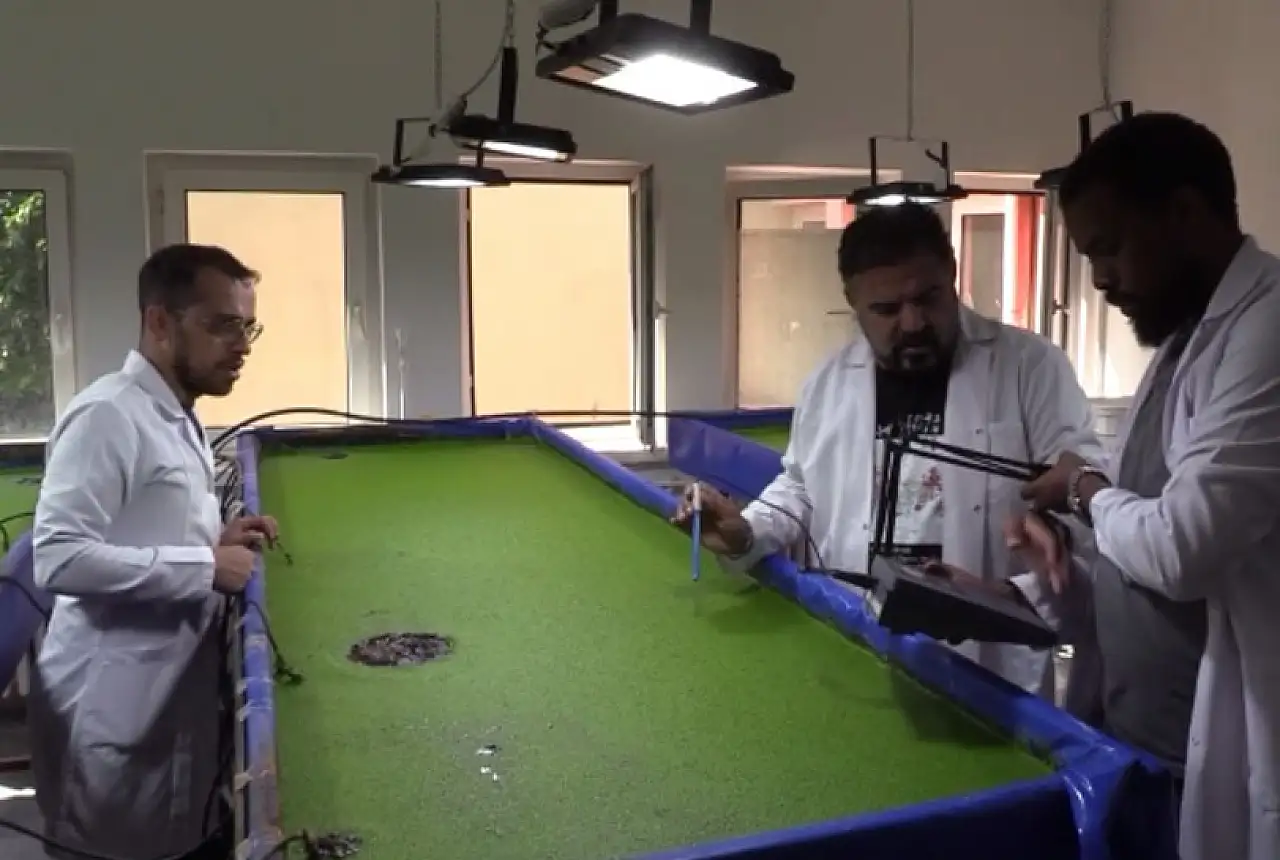 Bu çerçevede geliştirilen biyomineral solüsyonlar, laboratuvar ortamındaki 3 metrelik havuzlarda 200 litrelik su tanklarının içinde su mercimeği yetiştirilmesinde kullanılıyor. Bu besinin kuru ve yaş haliyle beslenen Japon balıklarının gübresi de başka bir havuzdaki çilek fidelerine aktarılıyor.