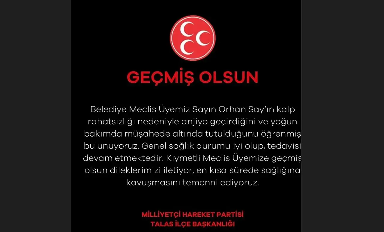 MHP Talas İlçe Başkanlığı'ndan yayınlanan mesajda şu ifadelere yer verildi: “Belediye Meclis Üyemiz Sayın Orhan Say'ın kalp rahatsızlığı nedeniyle anjiyo geçirdiğini ve yoğun bakımda müşahede altında tutulduğunu öğrenmiş bulunuyoruz. Genel sağlık durumu iyi olup, tedavisi devam etmektedir. Kıymetli Meclis Üyemize geçmiş olsun dileklerimizi iletiyor, en kısa sürede sağlığına kavuşmasını temenni ediyoruz.”