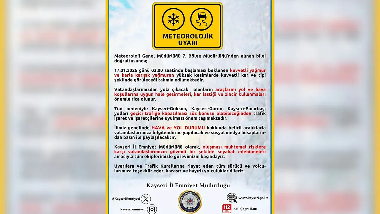 Kayseri İl Emniyet Müdürlüğü, Meteoroloji 7. Bölge Müdürlüğü’nden alınan bilgiler doğrultusunda vatandaşları kuvvetli yağış ve fırtınaya karşı uyardı. 17 Ocak 2026 günü saat 03.00’ten itibaren başlaması beklenen kuvvetli yağmur ve karla karışık yağmurun, yüksek kesimlerde yerini kuvvetli kar ve tipiye bırakacağı tahmin ediliyor.