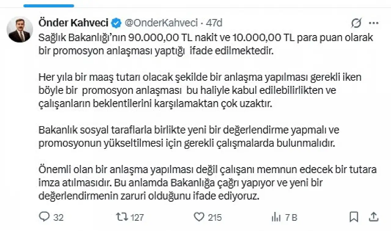 Türkiye Kamu-Sen ve Türk Sağlık-Sen Genel Başkanı Önder Kahveci, sosyal medya hesabından yaptığı açıklamalara göre ise Sağlık Bakanlığının 90.000 TL nakit ve 10.000 TL para puan olarak bir promosyon anlaşması yaptığını belirtti.