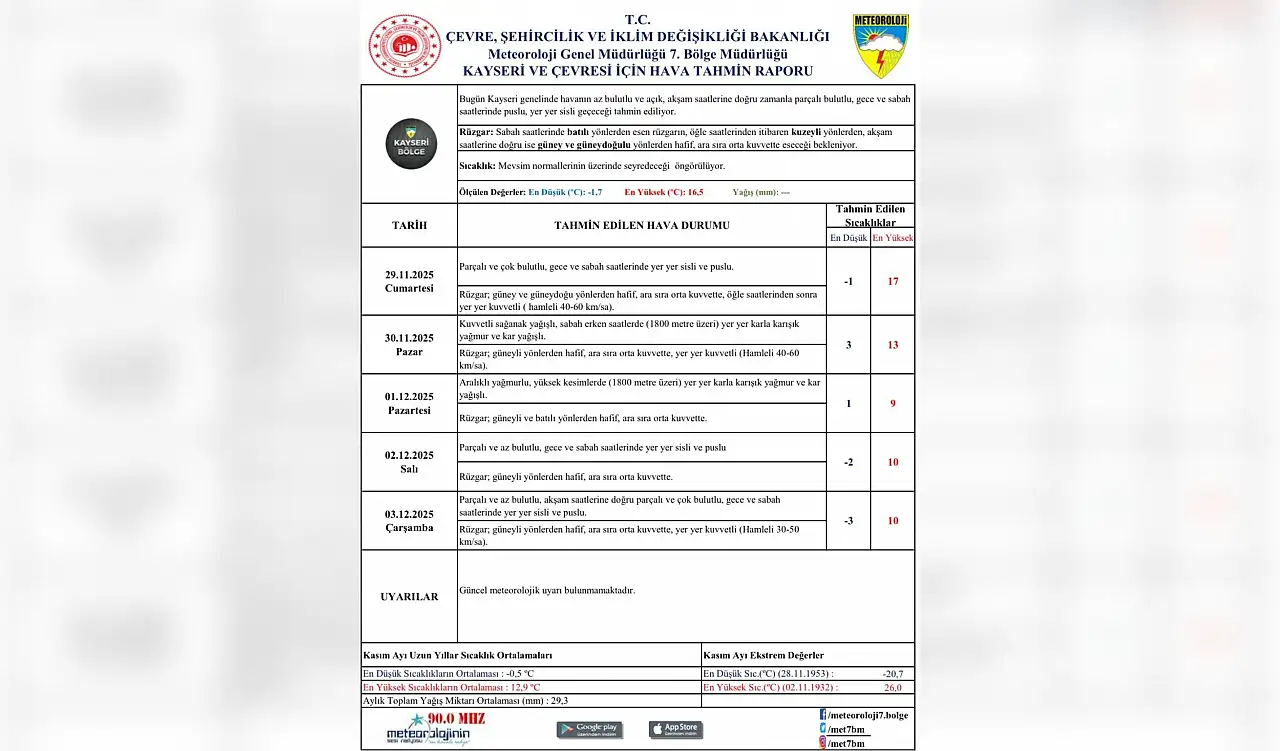 Meteoroloji Genel Müdürlüğü 7. Bölge Müdürlüğü'nün Kayseri ve Çevresi için hazırladığı hava tahmin raporuna göre, Kayseri'de mevsim normallerinin üzerinde seyredecek sıcaklıklara rağmen soğuk, rüzgârlı ve yağışlı bir hafta sonu bekleniyor.