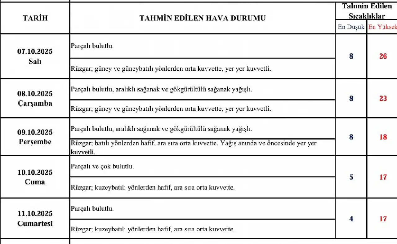 8 Ekim Çarşamba ve 9 Ekim Perşembe: Bu iki gün boyunca hava parçalı bulutlu, aralıklı sağanak ve gök gürültülü sağanak yağışlı olacak. Sıcaklıklar Salı gününe göre önemli ölçüde azalarak Çarşamba 23°C, Perşembe ise 18°C’ye inecek. Her iki günde de rüzgar, güney ve güneybatı yönlerden kuvvetli esecek.