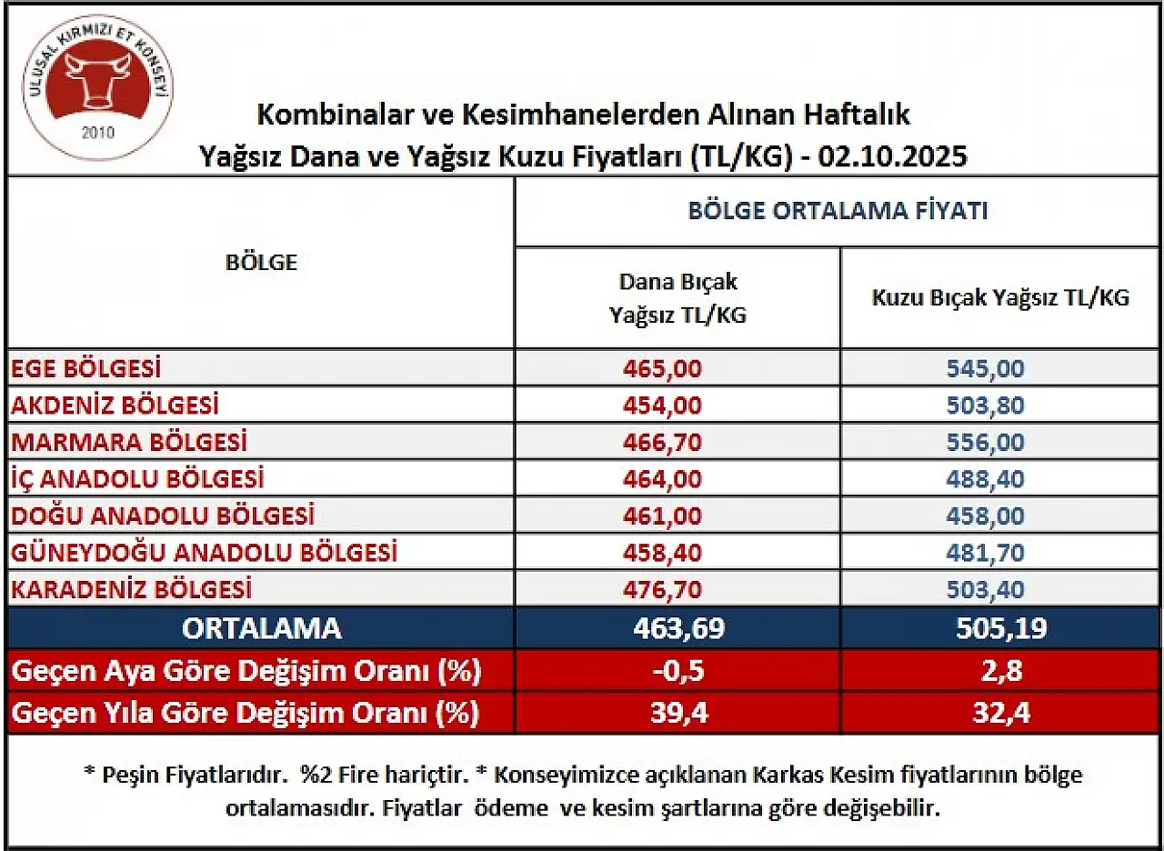 Ulusal Kırmızı Et Konseyi (UKON) tarafından 9 Ekim tarihli kombine ve kesimhanelerden alınan haftalık yağsız dana ve yağsız kuzu kesim fiyatları açıklandı. UKON'un haftalık raporuna göre İç Anadolu Bölgesi'nde yağsız kuzu ve dana kesim fiyatları yatay seyretti.