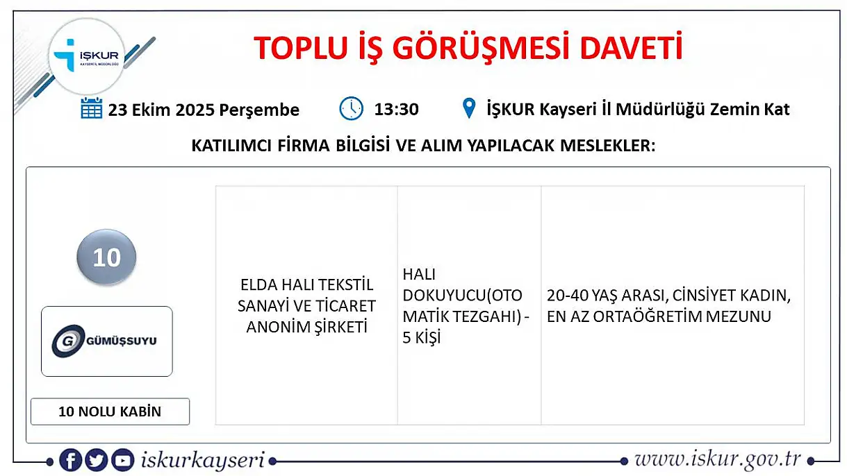 Haberler Güncel İş görüşme daveti: 22 firma, 363 kişiyi işe alacak! İş görüşme daveti: 22 firma, 363 kişiyi işe alacak! Kayseri'de iş arayanlar dikkat! İŞKUR, 22 firmanın katılımıyla 363 kişilik toplu iş görüşmesi düzenliyor. işkur kayseri PAYLAŞ 17.10.2025 18:38 Güncelleme: 17.10.2025 18:38 Rıdvan Mahmut BoyrazMuhabir TAKİP ET >> 11 23 PAYLAŞ Elda Halı Tekstil (Gümüssuyu): Halı dokuyucu (otomatik tezgahı)… Toplam: 5 kişi
