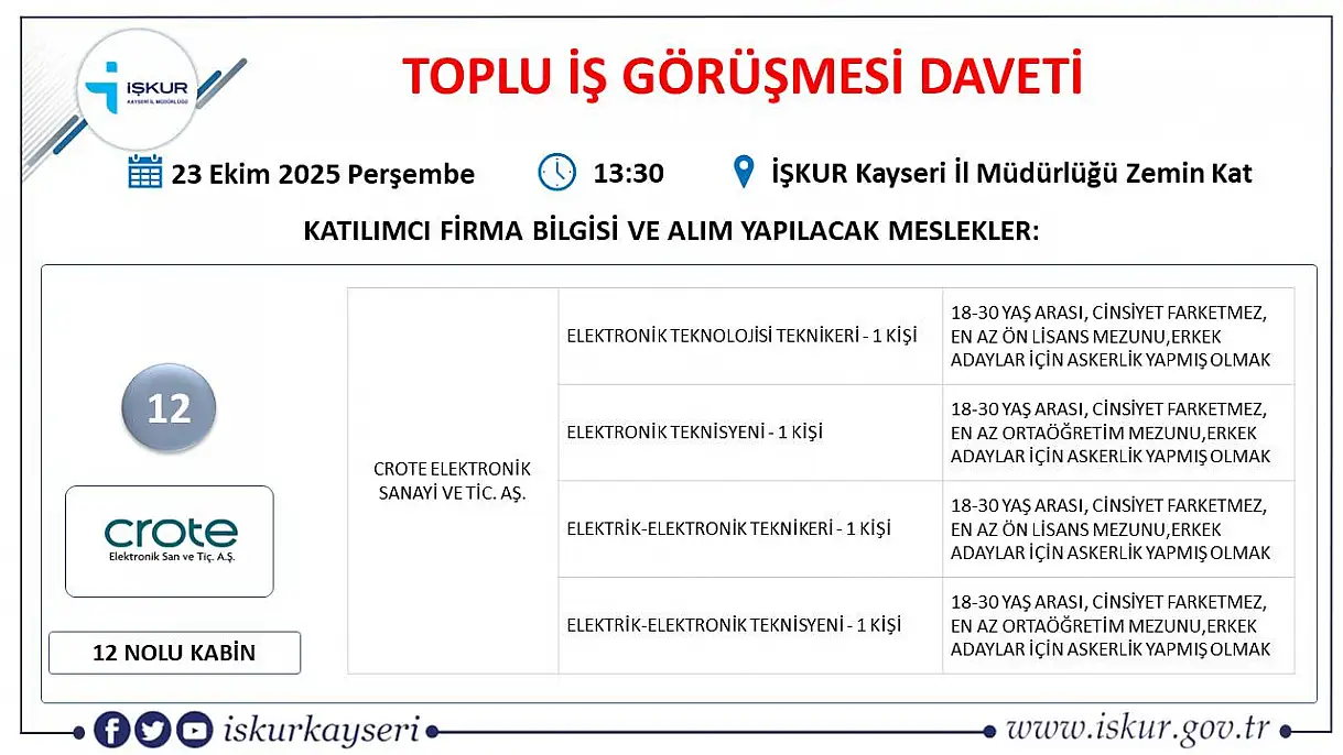 Haberler Güncel İş görüşme daveti: 22 firma, 363 kişiyi işe alacak! İş görüşme daveti: 22 firma, 363 kişiyi işe alacak! Kayseri'de iş arayanlar dikkat! İŞKUR, 22 firmanın katılımıyla 363 kişilik toplu iş görüşmesi düzenliyor. işkur kayseri PAYLAŞ 17.10.2025 18:38 Güncelleme: 17.10.2025 18:38 Rıdvan Mahmut BoyrazMuhabir TAKİP ET >> 13 23 PAYLAŞ Crote Elektronik Sanayi Ve Tic. A.Ş.: Elektronik teknolojisi teknikeri/teknisyeni, elektrik-elektronik teknikeri/teknisyeni… Toplam 4 kişi
