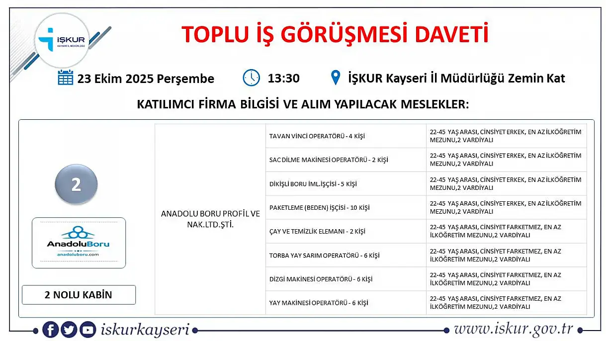 Anadolu Boru Profil Ve Nak. Ltd. Şti.: Tavan vinci operatörü, sac dilme makinesi operatörü, dikişli boru işçisi, paketleme işçisi, çay ve temizlik elemanı, torba yay sarım operatörü, dizgi makinesi operatörü, yay makinesi operatörü… Toplam: 37 kişi