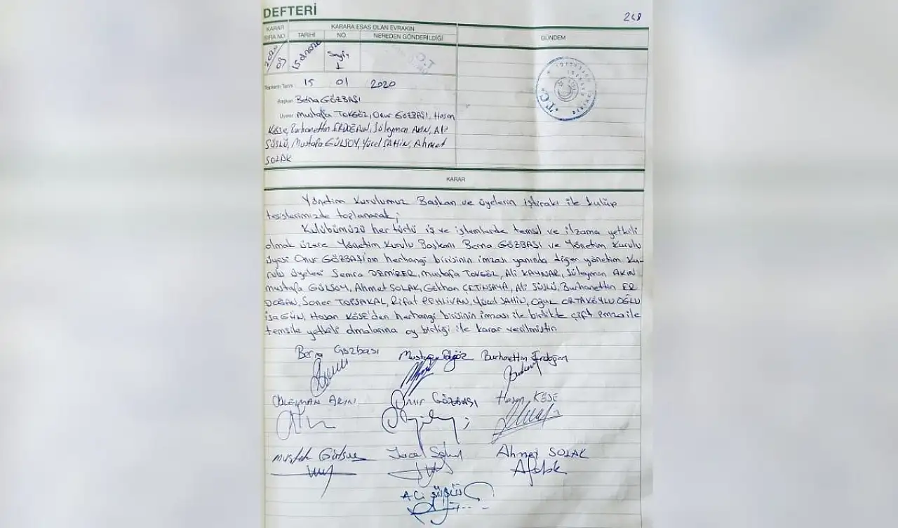 Kayserispor’un 15 Ocak 2020 tarihli karar defterinde Gökhan Çetinsaya’nın Kayserispor Yönetiminde yer aldığı imza altına alınmış.