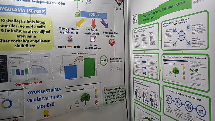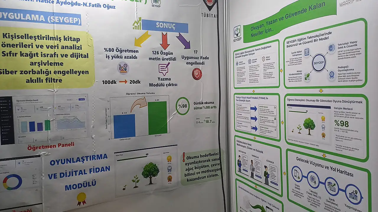 Kayseri’de düzenlenen 57. TÜBİTAK Lise Öğrencileri Araştırma Projeleri Yarışması’na Kayseri’den katılan lise 12. Sınıf öğrencisi Nusret Fatih Oğuz (17) ve 10. Sınıf öğrencisi Hatice Aydoğdu edebiyat alanında hazırladığı ’Sürdürülebilir Eğitim için Yapay Zeka Destekli Edebiyat Platformu’ (SEYGEP) projesi ile 1. oldu. Ankara’da yapılacak olan finallere gitmeye hak kazanan liseli öğrenciler; yaptıkları platformla okuma alışkanlığı kazandırırken, kâğıt israfını azaltmayı amaçladıklarını belirtti. 3 haftalık deneme sürecinde öğretmenlerin iş gücünün yüzde 80 ve öğrencilerin okuma motivasyonlarını yüzde 66 artırdığını söyleyen Nusret Fatih Oğuz; "Temel amacımız Türkiye Yüz Yılı Maarif modeli sürdürüle bilirlik ve dijital uyumlu bir platform oluşturarak Türkiye’deki okuma yazma oranını arttırmayı hedefliyoruz. Bu hedeflerimizin istikametinde bizim okuma modüllerimiz var, bu modüller her hangi bir okumama durumu olduğu zaman sistemimiz bu durumu tespit ediyor ve hemen uyarı gönderiyor. Sürdürülebilir Eğitim İçin Yapay Zekâ Desteli Güvenli Edebiyat Platformu (SEYGEP) uygulamamızda bizim sohbet grup kısmımız var. Bu grupta öğretmenler ve öğrenciler tamamen güveni bir şekilde istedikleri gibi sohbet edebiliyorlar. Bizim bu sistemde küfür algılaya bilen bir sistemimiz var. Her hangi bir argo, küfür 3 kez tekrarlandığında sistem otomatik olarak kullanıcıyı engelliyor.. Bizim öğrenci ve öğretmen gelişim merkezlerimiz var. Öğretmenlerimizin iş yükünü yüzde 80 oranında azaltırken, öğrencilerin okuma motivasyonlarını yüzde 66 arttırmakta. Biz 3 haftalık deneme sürecinin sonucunda öğrenciler 126 tane özgün metin üretirken, 17 tane küfürlü ifade engellendi. Bir diğer özelliği bizim kendi geliştirmiş olduğumuz yapay zekâ programımız. Sizin okudunuz kitaplara göre sizi analiz ediyor sizde bu analizlere göre sohbet ediyor. Sohbetler sonucunda karakter analizi yapabiliyorsunuz. Bu program ilkokul, ortaokul ve lise için. Eğer sizin okuduğunuz on tane kitap varsa onunu da listeliyor size analiz ediyor, size tekrar bir kitap suna biliyor ve kişiye özel kitap oluşuyor. Bizim değer verdiğimiz şey sürdürüle bilirlik. Her kitap bir fidan, bir fidan bir okuyucu anlayışını benimsiyoruz. Siz kitap okudukça dijital fidanlarınız yetişiyor ve bu sayede ormanlarımız ayakta kalabiliyor. Türkiye’deki ağaç israfını azaltmak için artık tamamen sanal bir ortam oluşturuyoruz ve tamamen kâğıt israfını azaltıyoruz" dedi.