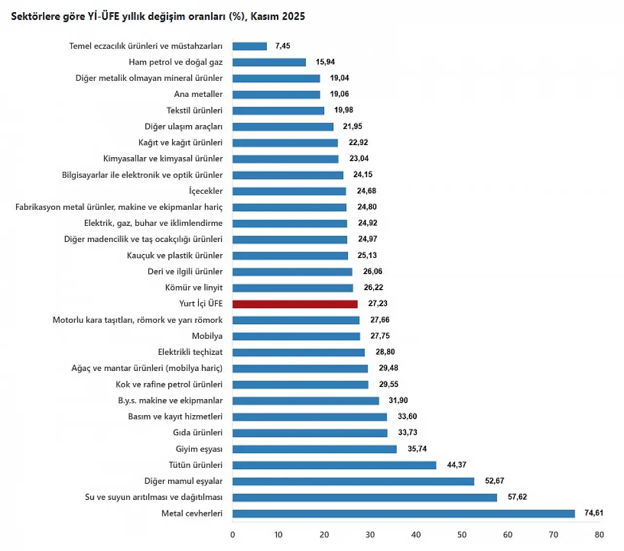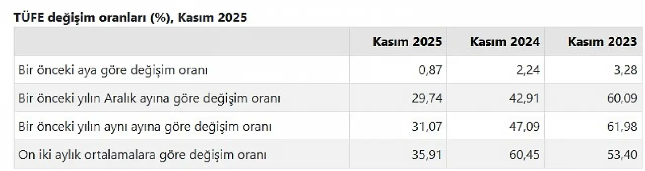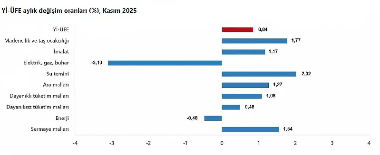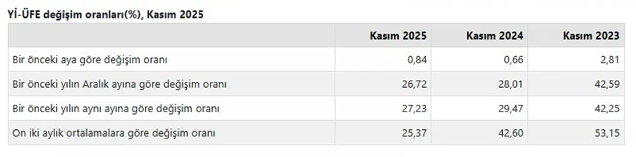 Yİ-ÜFE 2025 yılı Kasım ayında bir önceki aya göre yüzde 0,84 artış, bir önceki yılın Aralık ayına göre yüzde 26,72 artış, bir önceki yılın aynı ayına göre yüzde 27,23 artış ve on iki aylık ortalamalara göre yüzde 25,37 artış gösterdi.