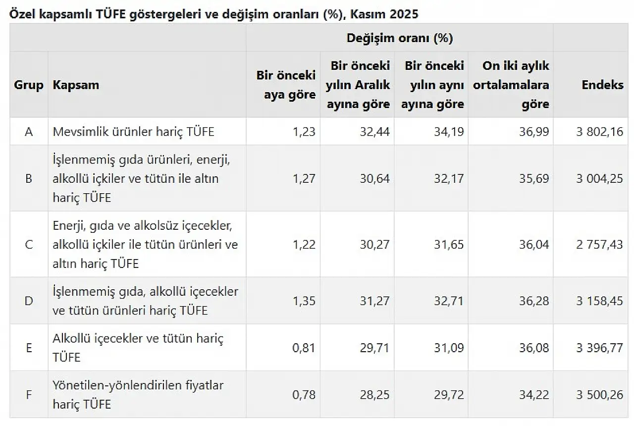 İşlenmemiş gıda ürünleri, enerji, alkollü içkiler ve tütün ile altın hariç TÜFE'deki değişim, 2025 yılı Kasım ayında bir önceki aya göre yüzde 1,27 artış, bir önceki yılın Aralık ayına göre yüzde 30,64 artış, bir önceki yılın aynı ayına göre yüzde 32,17 artış ve on iki aylık ortalamalara göre yüzde 35,69 artış olarak gerçekleşti.