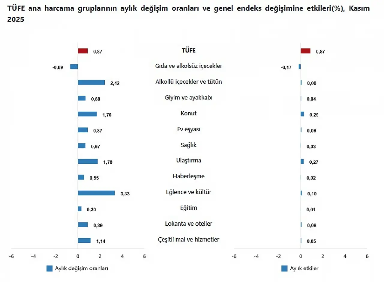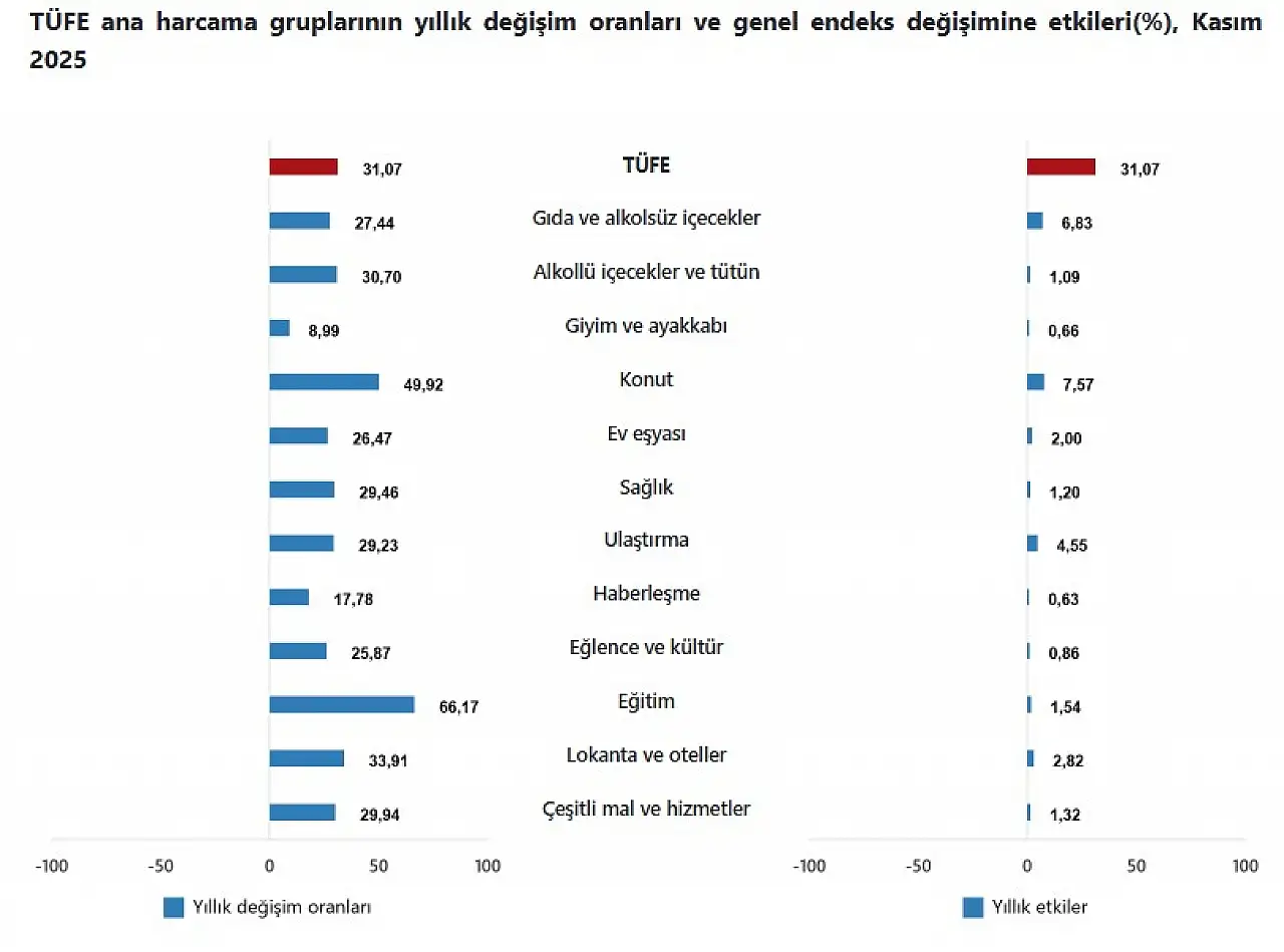 Türkiye İstatistik Kurumu (TÜİK), Kasım ayı Tüketici Fiyat Endeksi verilerini açıkladı. Bu göre, TÜFE'deki değişim 2025 yılı Kasım ayında bir önceki aya göre yüzde 0,87 artış, bir önceki yılın Aralık ayına göre yüzde 29,74 artış, bir önceki yılın aynı ayına göre yüzde 31,07 artış ve on iki aylık ortalamalara göre yüzde 35,91 artış olarak gerçekleşti.