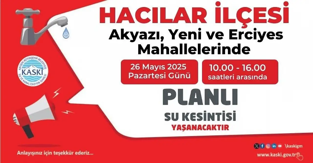 Kesintinin 5 saat süreceği bildirilirken, vatandaşların tedbir alması istendi. Açıklamada; "Akyazı, Yeni ve Erciyes Mahallelerinde içme suyu bağlantı çalışması nedeniyle 26.05.2025 tarihinde 10.00 - 16.00 saatleri arasında planlı su kesintisi yaşanacaktır. Anlayışınız için teşekkür ederiz.” denildi.
