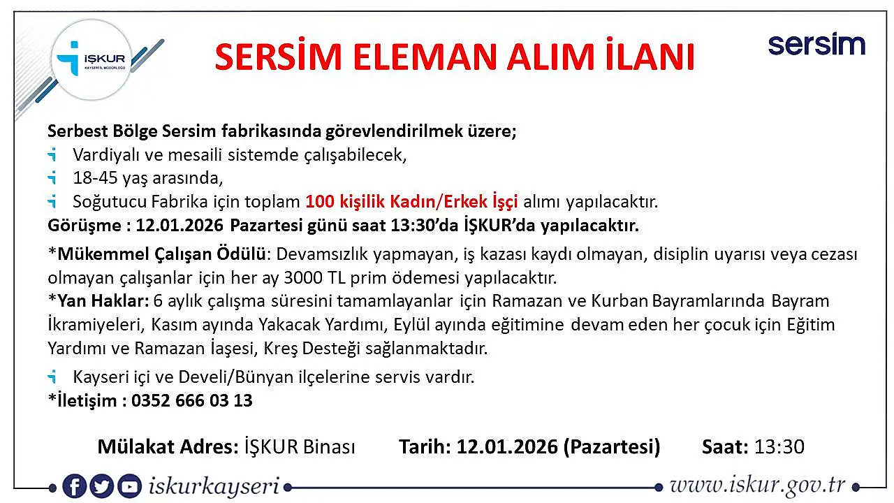 Kayseri’de iş arayanlar için müjdeli haber geldi. Çalışma ve İş Kurumu İl Müdürlüğü (İŞKUR) tarafından Serbest Bölge’de faaliyet gösteren ve mükemmel çalışma ödülüyle dikkat çeken Sersim fabrikasının personel alımı yapacağı paylaşıldı. Buna göre, Serbest Bölge'de faaliyet gösteren Sersim soğutucu fabrikası için vardiyalı ve mesaili sistemle çalışabilecek, 18-45 yaş arasında kadın-erkek toplam 100 kişilik alım yapacak.