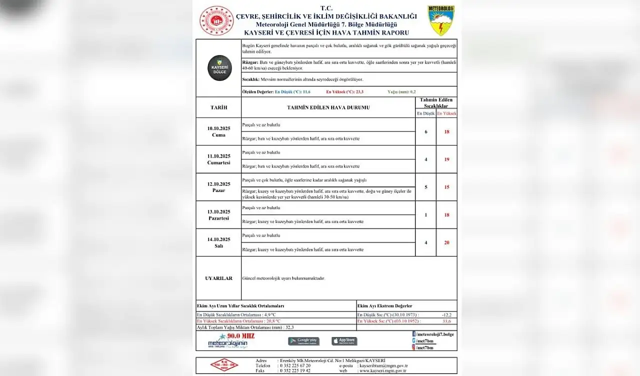 Diğer yandan Meteoroloji 7. Bölge Müdürlüğü 5 günlük hava tahmin raporunu da yayımladı. Rapora göre, pazar gününe kadar yağış bekleniyor. Pazar gününün ardından havaların yine parçalı ve az bulutlu geçeceği tahmin ediliyor.