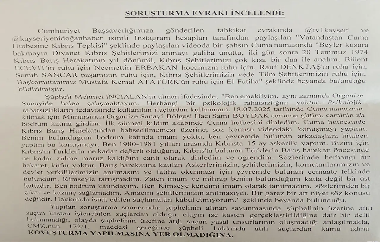 Bu gelişmenin ardından Mehmet İncialan, ‘Benim için kaygı duyan dostlarıma duyuru! Mimarsinan OSB camiinde Kıbrıs Şehitleri için dua istememden dolayı hakkımda Kayseri Cumhuriyet Başsavcılığınca açılan soruşturmada takipsizlik kararı verilmiştir’ dedi. İncialan, bu yönde ifadesinin ve kararında yer aldığı tutanağı da paylaştı.