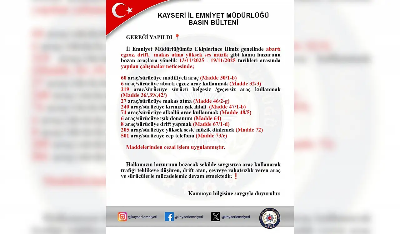 Kayseri İl Emniyet Müdürlüğü, 13-19 Kasım 2025 tarihleri arasında kent genelinde kamu huzurunu ve trafik güvenliğini bozan araçlara yönelik yürüttüğü denetimlerin sonuçlarını paylaştı. Bir haftalık operasyonlar neticesinde toplam 1.440 araç/sürücüye cezai işlem uygulandı.