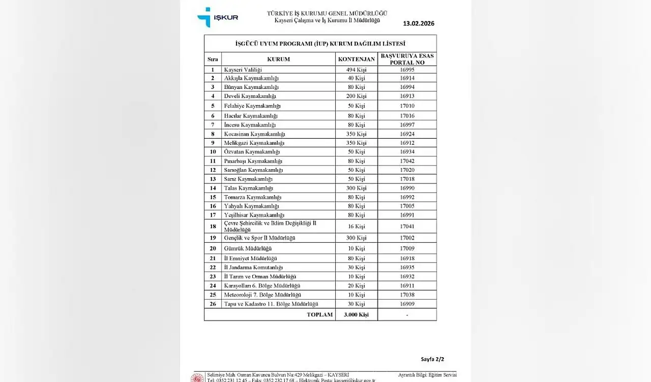 Kayseri’de iş arayanlara müjdeli haber geldi. Kentte Çalışma ve İş Kurumu İl Müdürlüğü ile Kayseri Valiliği, Kaymakamlıklar ve kamu kurumları dev personel alımı yapacak. Bu kurumlarda temizlik, bakım ve onarım faaliyetlerinin desteklenmesi maksadıyla 3.000 kişilik (üç bin) İşgücü Uyum Programı (İUP) kapsamında alım yapılacak.