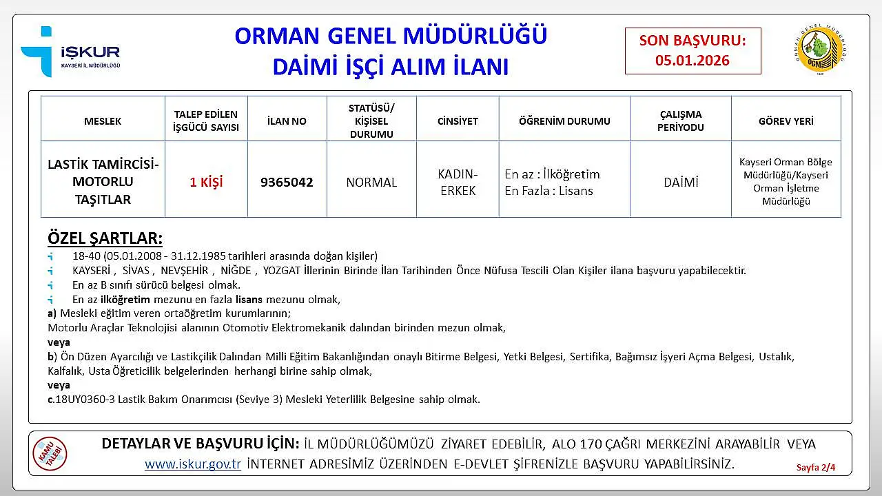 Kayseri Orman Bölge Müdürlüğü tarafından dikkat çeken bir iş ilanı yayımlandı. İlanda sadece 1 kişilik alım yapılacağı paylaşıldı. İş için özel şartlar da açıklandı. Detaylar Kayseri Olay haber merkezince derlediğimiz haberimizde.