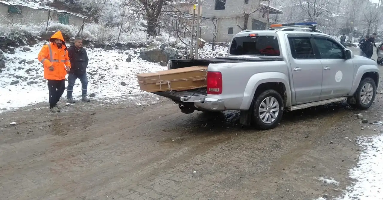 Diğer yandan kurtarma çalışması için harekete geçen belediye aracında yer alan tabut ise dikkat çekti.