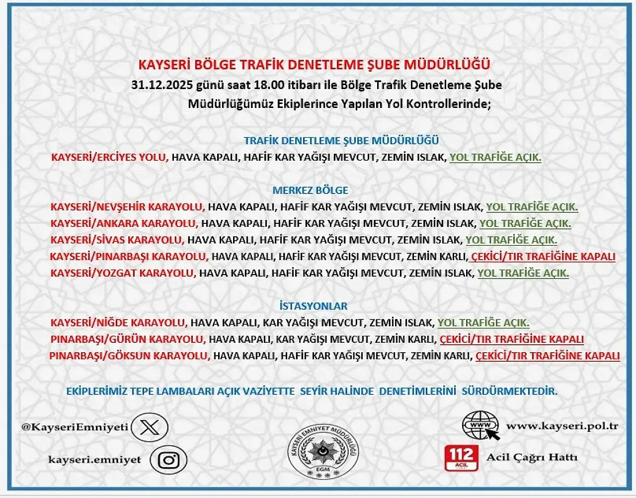 Kayseri Bölge Trafik Denetleme Şube Müdürlüğü saat 18.00 itibarıyla şehir genelindeki yol kontrollerine ilişkin güncel durumu paylaştı. İl genelinde hafif kar yağışı etkisini sürdürürken, bazı kritik güzergahlarda ağır vasıtalar için kısıtlamaya gidildi.