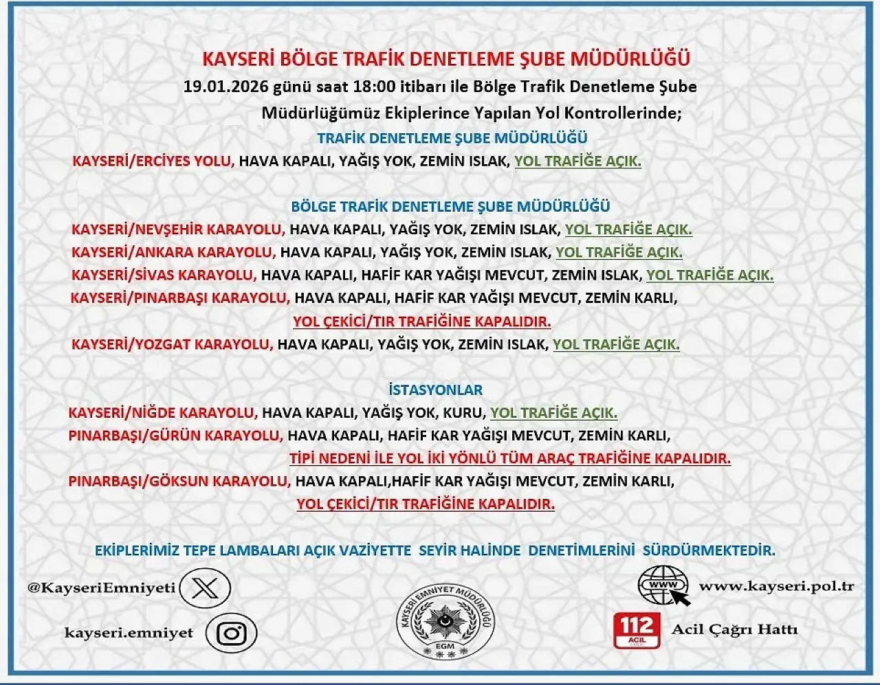 Kayseri Bölge Trafik Denetleme Şube Müdürlüğü, 19 Ocak saat 18:00 itibarıyla yol durumunu açıkladı.