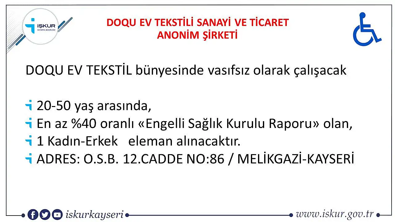 Farklı sektörlerde iş arayanlar için önemli bir adres olan İŞKUR bu kez engelli vatandaşlar için toplu iş görüşmesi gerçekleştirecek. Kentte faaliyet gösteren Peyname Yöresel Şarküteri ve Gıda Ürünleri San. Tic. A.Ş., Somçelik Raf Sanayi ve Ticaret Ltd. Şti., Doqu Ev Tekstili Sanayi ve Ticaret Anonim Şirketi, engelli personel alımı yapacak.