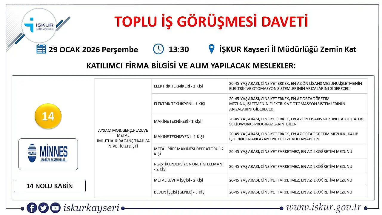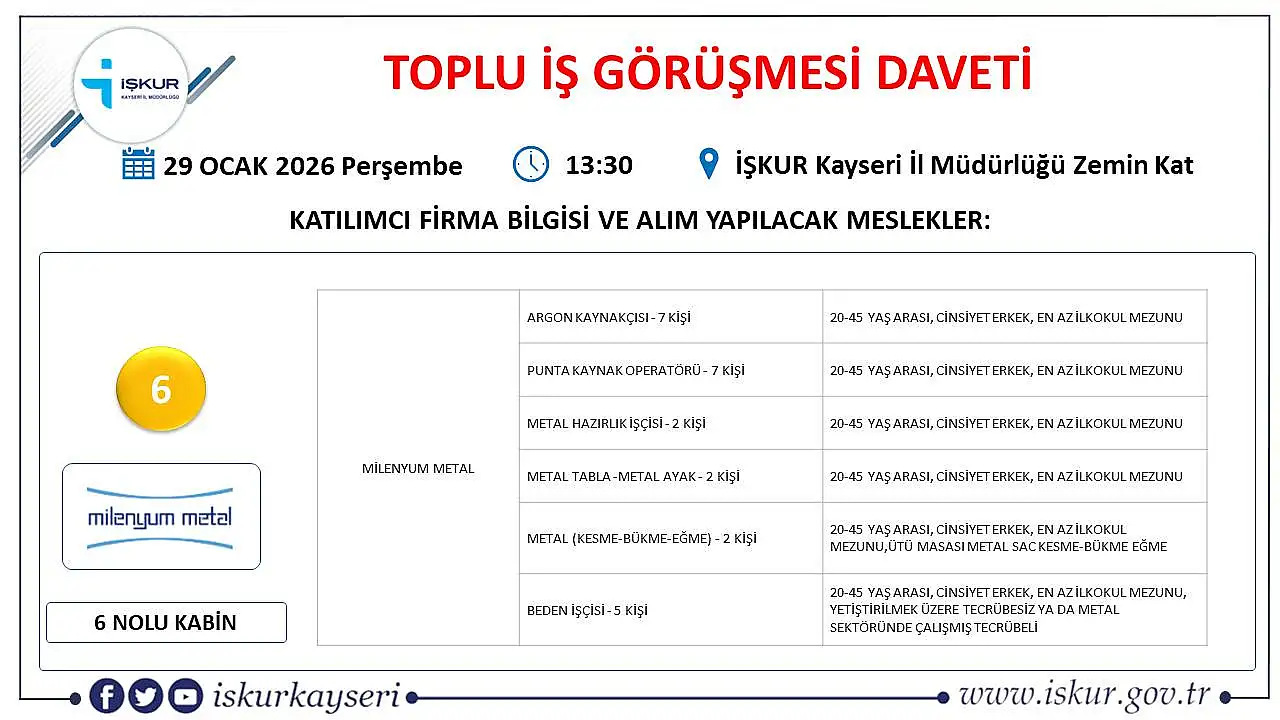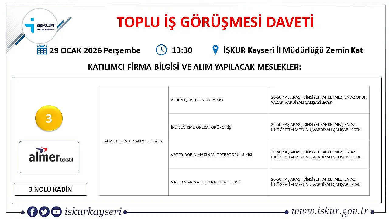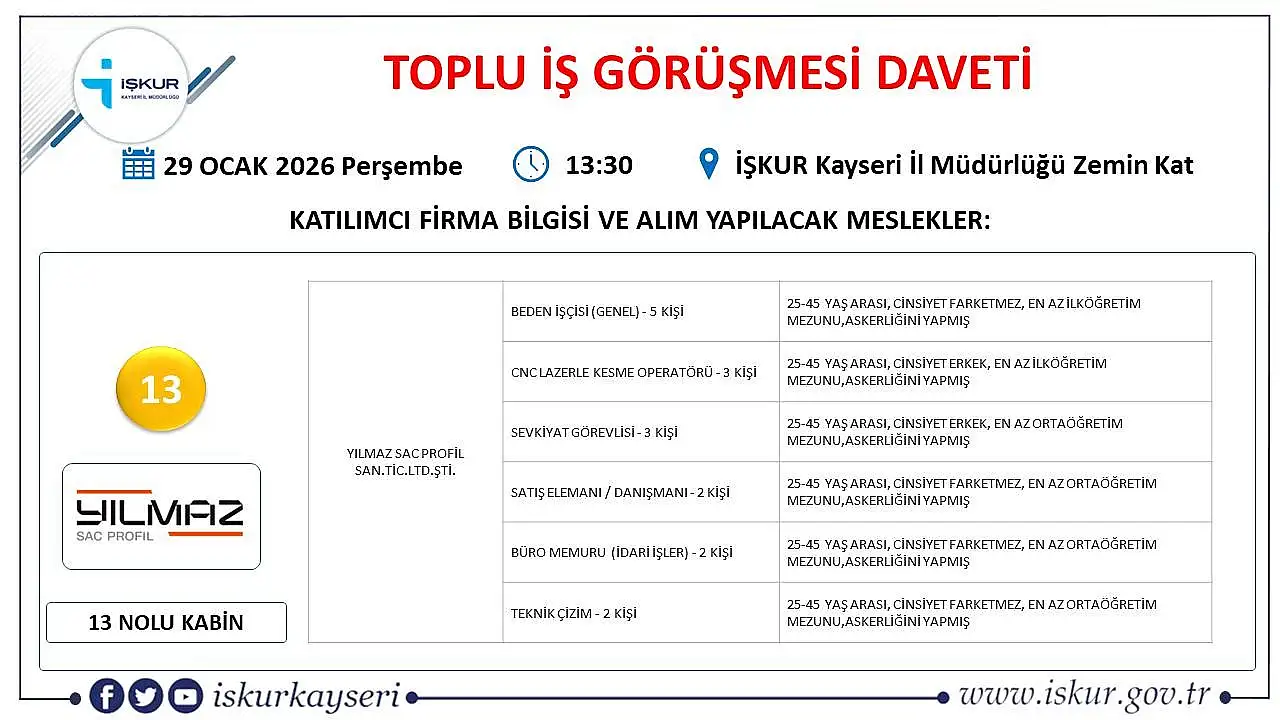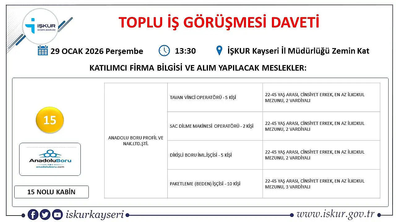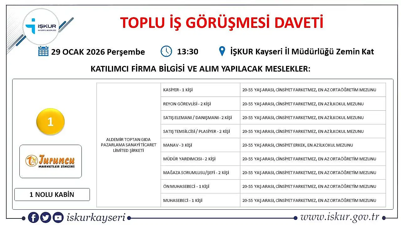 Yüzlerce kişinin alınacağı farklı çok sayıda iş için İŞKUR, toplu iş görüşmesi yapacak. Toplu iş görüşmesi bugün saat 13.30’da İŞKUR il binasında yapılacak. İŞKUR tüm iş arayanları görüşmeye davet ederek, “29 Ocak Perşembe günü saat 13.30’da tüm iş arayanlarımıza yönelik olarak isimleri belirtilen firmaların katılımıyla personel toplu görüşmesi/seçmesi yapılacaktır. İş arayan tüm vatandaşlarımızı kurumumuza bekliyoruz.” ifadeleri kullanıldı.