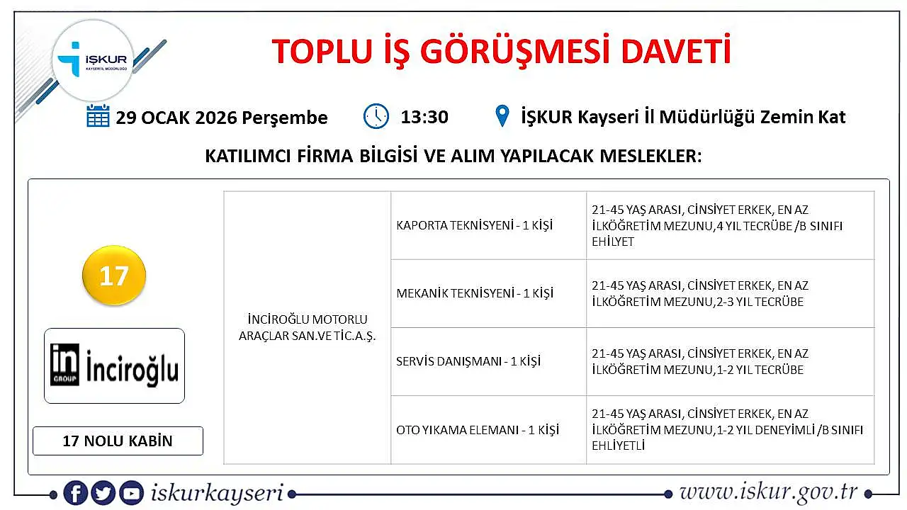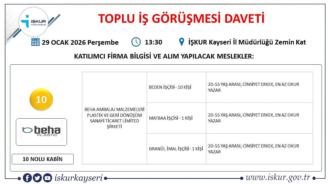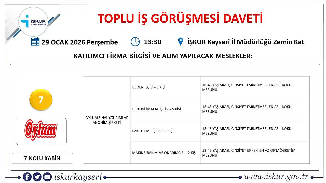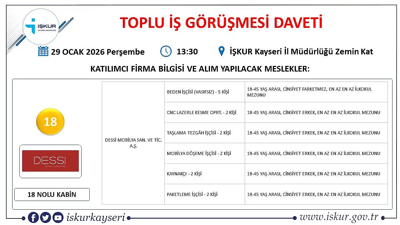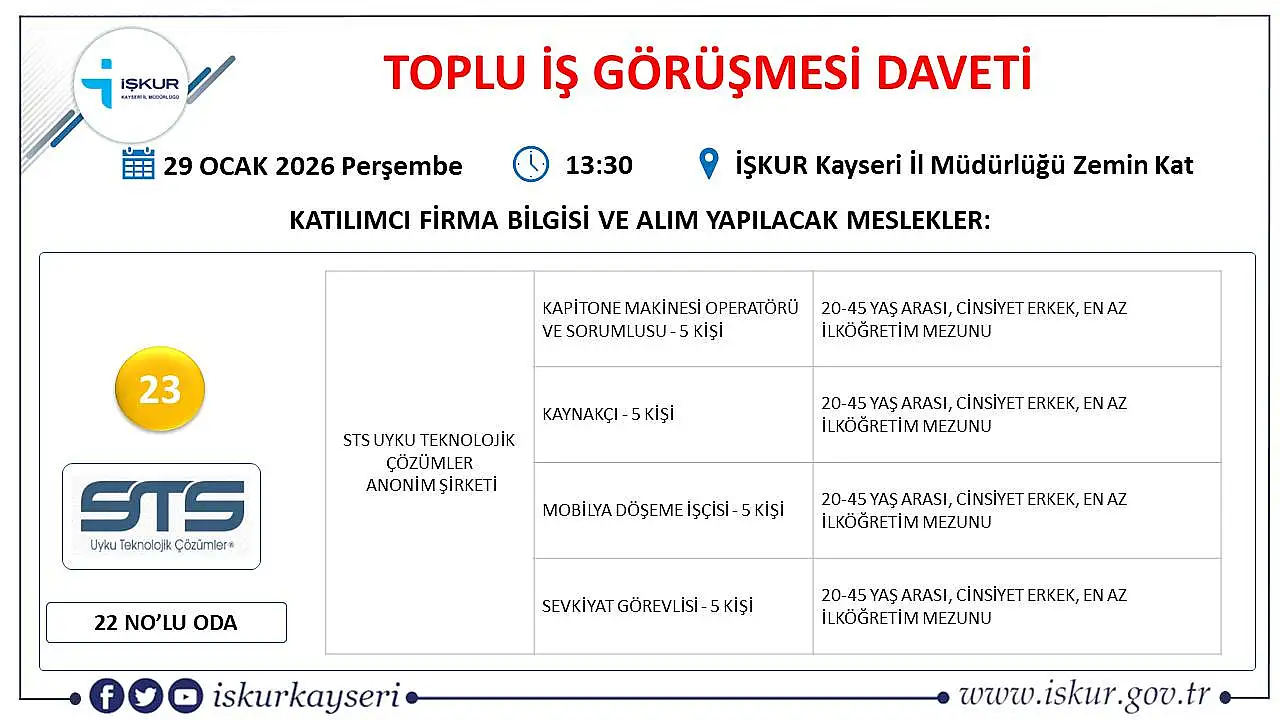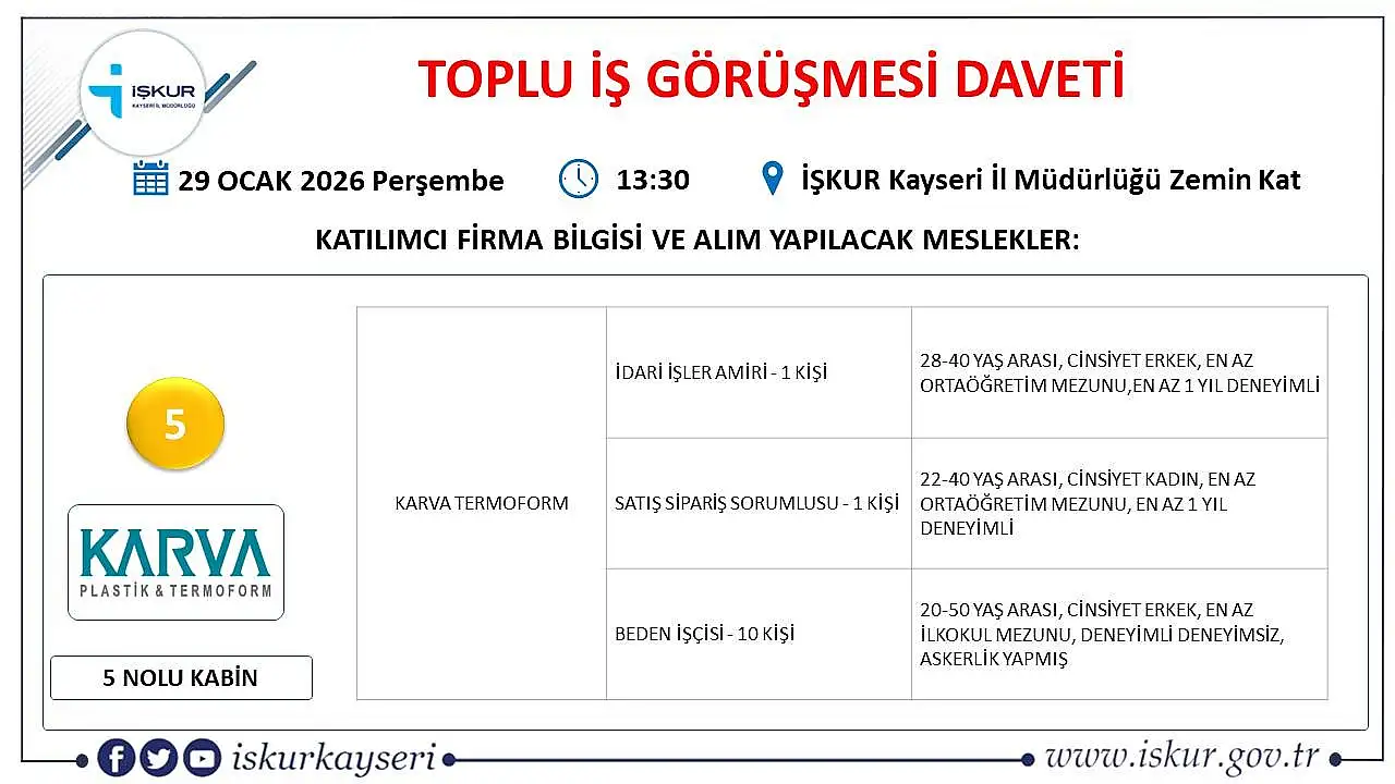 Yüzlerce kişinin alınacağı farklı çok sayıda iş için İŞKUR, toplu iş görüşmesi yapacak. Toplu iş görüşmesi bugün saat 13.30’da İŞKUR il binasında yapılacak. İŞKUR tüm iş arayanları görüşmeye davet ederek, “29 Ocak Perşembe günü saat 13.30’da tüm iş arayanlarımıza yönelik olarak isimleri belirtilen firmaların katılımıyla personel toplu görüşmesi/seçmesi yapılacaktır. İş arayan tüm vatandaşlarımızı kurumumuza bekliyoruz.” ifadeleri kullanıldı.
